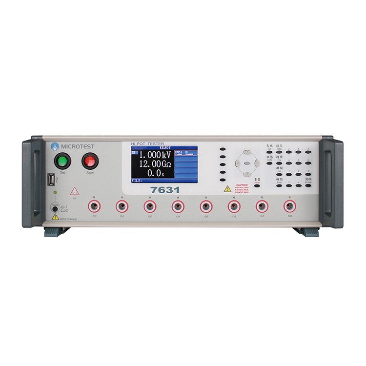 7631为8通道耐压测试仪,AC 高压5000V,DC 高压6000V,绝缘阻抗1.2GΩ。内部记忆体可存15组测试档案,每组档案支援32测试步骤,在量测技术上使用高端32Bit True-RMS DSP(数位信号处理器),有别于一般量测所使用的ADC(类比数位转换积分器)。除了32 位元的资料提高相当的精准度外,对于交流信号处理的速度也能增快数十倍,不仅精确稳定,对于AC 高压和漏电流测试时间更是极大的提升。7631耐压测试仪有高效率PWM 放大器,隔绝外部电压变动影响,输出稳定的高电压,即使在电压变动大的地区,也可以实现「安全」、「可靠」的量测。 性能特点 量测数据 项目 | 量测范围 | 解析度 | 精准度 | AC 输出电压 | 10V ~ 5000V | 1 | ±(3% of setting+5V) | AC 输出频率 | 50 / 60Hz | | | AC 上限漏电流 | 0.001 ~ 31mA | 0.001 | ±3% | AC 下限漏电流 | 0 .000~ 30.99mA | 0.001 | ±3% | AC 测试时间 (上升时间) | 0.1 ~ 999s (0.1 ~ 10s) | 0.1 | | AC 电弧侦测 | 侦测档位从0 ~ 20 (1为最灵敏) | | | DC 输出电压 | 10V ~ 6000V | 1 | ±(3% of setting+5V) | DC 上限漏电流 | 0.001 ~ 11mA | 0.001 | ±3% | DC 下限漏电流 | 0.000 ~ 10.99mA | 0.001 | ±3% | DC 测试时间 (上升时间) | 0.1 ~ 999s (0.1 ~ 10s) | 0.1 | | DC 电弧侦测 | 0 ~ 10 (1为最灵敏) | | | IR 输出电压 | 10 ~ 1000Vdc | 1 | ±(3% of setting+5V) | IR 上限范围 | 1 ~ 12000MΩ | 1 | 100 ~ 500V, 1 ~ 1000MΩ(±5%) 500 ~ 1000V, 2 ~ 12000MΩ(±5%) | IR 下限范围 | 0 ~ 11999MΩ | 1 | IR 测试时间 (上升时间) | 0.1 ~ 999s (0.01 ~ 10s) | 0.1 | |