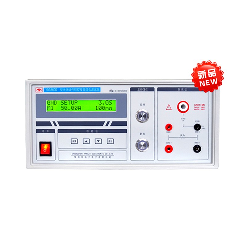 产品规格 型号 | YD9860D | 耐压测试 | AC | 输出电压范围 | 0.5kV – 5kV | | 电压分辨率 | 1V | | 电压精度 | ±2% | | 电压频率 | 50 或 60Hz可选 | | 最大输出电流 | 20mA | | 电流设置 | 0 - 20mA | | 电流分辨率 | 10uA | | 电流精度 | ±2% | DC | 输出电压范围 | 0.5kV – 6kV | | 电压分辨率 | 1V | | 电压精度 | ±2% | | 最大输出电流 | 10mA | | 电流设置 | 0 - 9999uA | | 电流分辨率 | 1uA | | 电流精度 | ±2% | 绝缘电阻测试 | IR | 输出电压范围 | 500V – 1500V | | 电压分辨率 | 1V | | 电压精度 | ±2%+5V | | 电阻测量范围 | 1 - 9999MΩ | | 电阻测量精度 | ±10% | | 电阻上限设定 | 1 - 9999MΩ | | 电阻下限设定 | 1 - 9999MΩ | 接地电阻测试 | GND | 最大输出电压 | 12V DC | | 输出电流范围 | 10 - 52A DC | | 电流分辨率 | 0.01A | | 电流精度 | ±3% | | 电阻测量范围 | 0 – 300mΩ | | 电阻分辨率 | 1mΩ | | 电阻精度 | ±3% | | 电阻设置范围 | 0 – 300mΩ | 其它技术指标 | | 通讯口 | RS232、PLC接口 | | 工作温湿度 | 0 – 40度,< 80%RH | | 电源要求 | 198 – 242V,47.5 – 52.5Hz | | 尺寸 | 405x185x455 | | 重量 | 18kg |