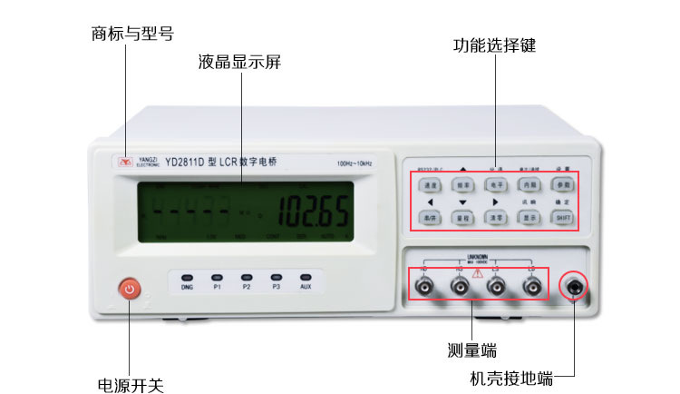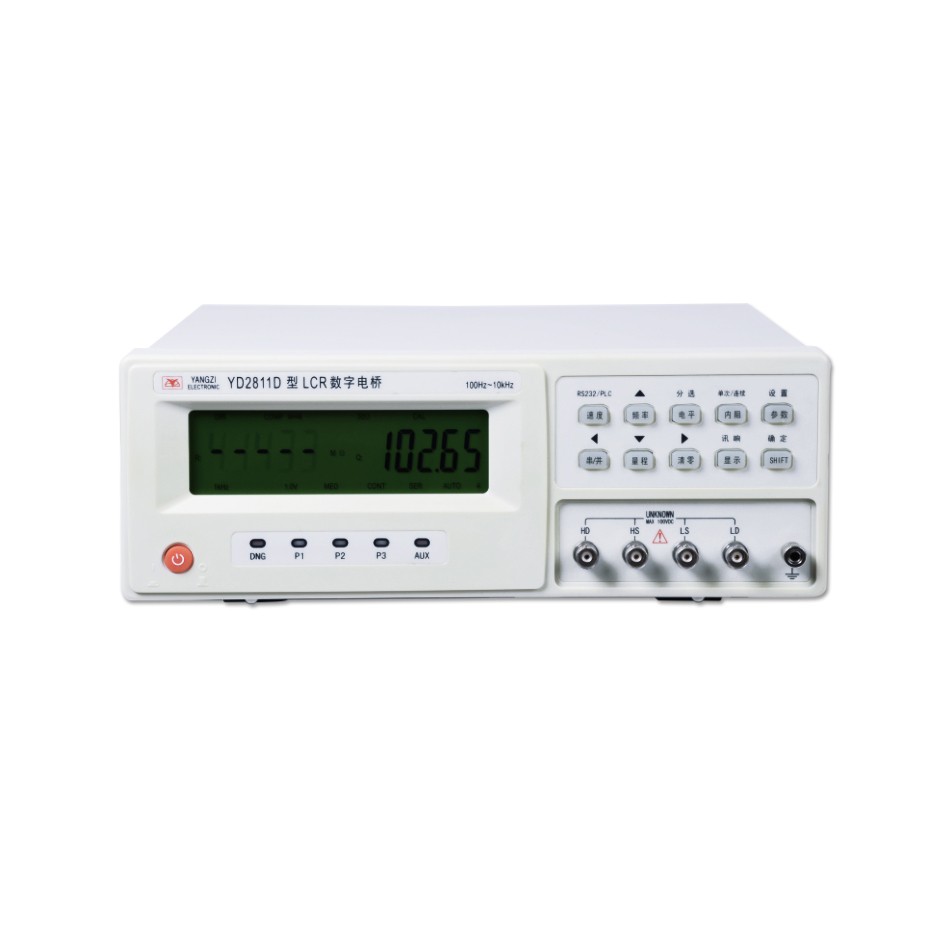 YD2811D 性能特点 ◆操作简便 ◆测试速度快,读数稳定性好 ◆大型专用LCD显示屏 ◆三个典型测试电平 ◆30Ω,100Ω两种可选源阻抗 ◆五档分选功能 ◆标准配置HANDLER接口 ◆选配RS232C接口 YD2811D 技术参数 测试参数 | L—Q、C—D、R—Q、Z—D | 基本准确度 | 0.1%(基本量程内) | 测试频率 | 100Hz、120 Hz、1k Hz、10k Hz | 显示范围 | L: 0.01 uH——9999H C: 0.01 pF——99999uF R: 0.0001Ω——99.99MΩ Z: 0.0001Ω——99.99MΩ D: 0.0000——9.999 Q: 0.01——999.9 | 测试电平 | 0.1V、0.3V、1V | 测试速度 | 快速:12次/秒、中速:5.1次/秒、慢速:2次/秒 | 等效方式 | 串联、并联 | 量程方式 | 自动、锁定 | 显示方式 | 直读、百分比 | 内阻方式 | 30Ω、100Ω | 校准方式 | 扫频开路、短路 | 元件分选 | 三档主参数合格分选、一档主副参数不合格分选 | 报警方式 | 合格报警,不合格报警,一档、二档、三档主参数合格报警、报警关闭 | 仪器接口 | PLC接口、RS232C(选件) |