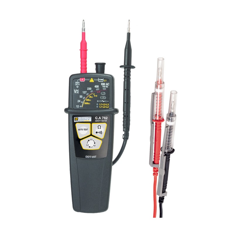 CA762低电压测试仪是电工电气安装前测试电压是否存在的必备工具。符合IEC61243-3,可用于室内或室外600V CAT IV的安装工作。 该设备配备了冗余电源安全系统,LED灯在电压超过50VAC/120VDC时闪烁。CA762自动检测电路、电源和测试线的状态。 测试探针和导线是可以拆卸的。配件CA751可以直接而简便的测试2P+E插座。 性能特点: