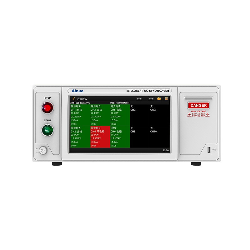 AN1633A/AN1633B系列 10通道并行-智能安规综合分析仪 艾诺AN1633A/AN1633B系列智能安规综合分析仪,具备交流而耐压、直流耐压、绝缘电阻三合一功能,采用主机+模组的方式,实现多模组即插即用、多通道灵活配置、多工况任意测试,可满足新能源汽车PDU、动力电池包、充电器、逆变器、变压器、连接器、接触器、电线电缆等电子零部件的多点耐压绝缘的快速高效安规识测试。 产品性能特点