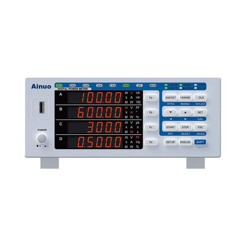 AN8721系列 交直流单相功率计 交、直流功率测量仪AN8721PV3系列(以下简称测量仪)以STM32控制器为核心,采用直接采样和智能判别技术,广泛应用于单相用电设备的电压、电流、功率、功率因数、频率、电能量、时间等电参数测量,测量范围广,采用窗口LED高亮显示,按键简单快捷,同时具有U盘读写、串行通讯、参数声光报警、电压/电流变比设置等功能,具有一机多用、精确耐用的特点。 产品性能特点