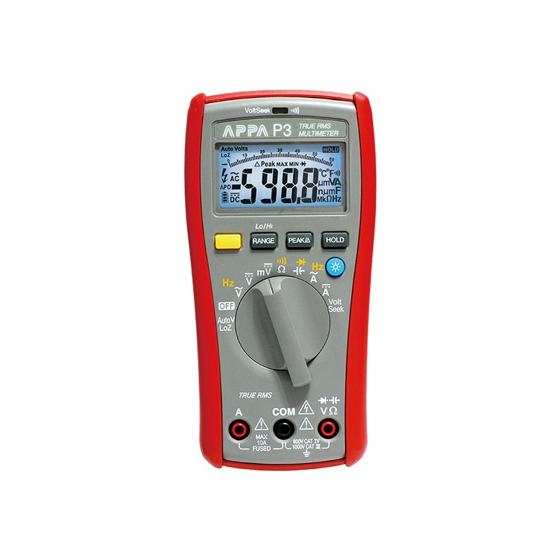 工业用及商业用万用电表 6000计数显示与60段模拟读条 LED背光显示 交流电压/交流电流的真有效值量测 L0Z可避免因离散电压所造成之错误读值 自动伏特可自动选择交流电/直流电压 用于采集峰值读数的峰值保持 11A/1000V高能量保险丝 包括带探头支架、倾斜支架和磁性贴纸的皮套 技术参数 规格 | 直流电压 | 600.0mV, 6.000V, 60.00V, 600.0V, 1000V | 交流电压 | 600.0mV, 6.000V, 60.00V, 600.0V, 1000V | Auto-V LoZ | 600.0V, 1000V | 直流电流 | 6.000A, 10.00A | 交流电流 | 6.000A, 10.00A | 电阻 | 600.0Ω~40.00MΩ | 连续性蜂鸣 | <20Ω, 2KHz | 二极管 | 1.500V | 频率 | 100.00Hz~100.00KHz | 电容 | 1.000μF~10.00mF | 基本信息 | 显示计数 | 6,000 | 采样频率 | 3 次/秒 | 过压指示 | "OL" 或 "-OL" | 低电量提示 |
