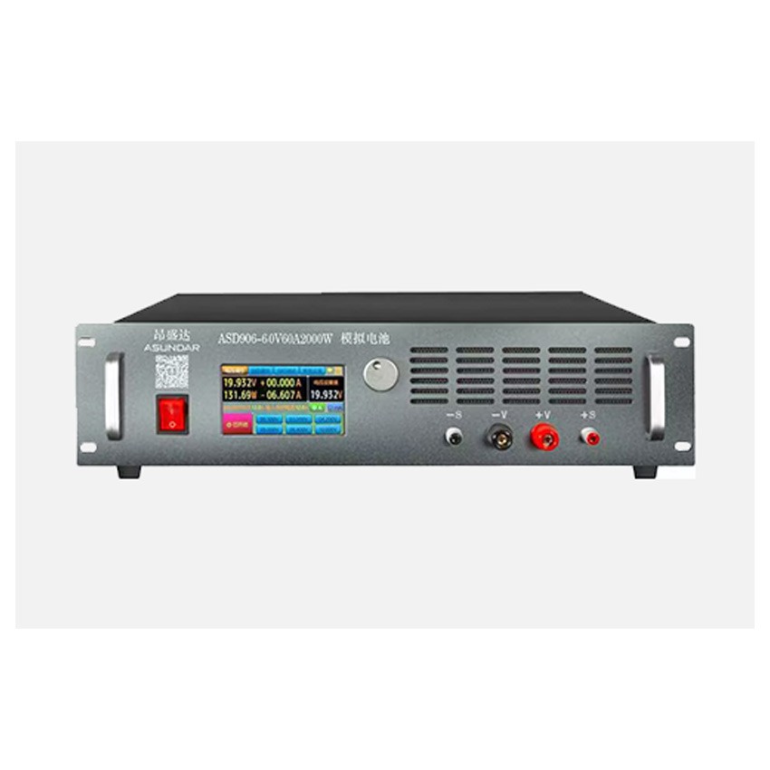 ASD906 2KW大功率模拟电池 ASD906-60V60A2000W模拟电池具有充放电功能,可模拟电池组的充放电功能,从而代替电池对普通储能移动电源的PCBA板进行功能或性能测试。主要用于移动电源、蓝牙耳机、蓝牙音箱等电池充放电产品的开发和实验,也可当作普通可调电源使用。其输入输出电压,和输入输出电流保护值均可设定。可连接PC机通过上位机软件进行远程控制,能设置规定时间内连续变化的动态电压,并能直观显示测试过程中电压电流随时间变化的曲线关系。 产品特点