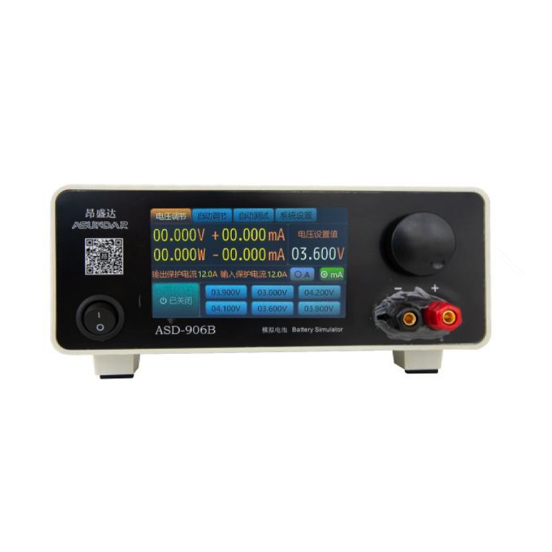 ASD-906B 模拟电池 ASD 906B模拟电池具有充放电功能,可模拟24V 10A的电池,最大充电24V 10A,最大放电24V 10A,并可作为六位半电流表测试PCBA的静态电流。该设备主要用于移动电源、蓝牙耳机、蓝牙音箱等电池供电产品或带电池产品的开发和试验,亦可作为普通可调电源使用。其输出电压和输入、输出电流保护值均可设定。在PC通讯模式下,能设置规定时间内连续变化的动态电压,并能直观显示测试过程中电压电流随时间变化的曲线关系。 产品特点 4.3寸高清液晶触摸屏,支持参数直接输入; 增加手动界面模拟上位机测试条件可进行电池电压步进模拟和多点曲线模拟功能; 可通过PC机进行控制,并能设置连续变化的动态电压; 能直观显示测试过程中电压电流随时间变化的曲线关系; 兼具电池的充电和放电功能,支持快速切换; 支持手动调试界面,操作简单,功能全面; 6组电压设定记忆存储功能,可一键调用; 可检测PCBA或成品待机电流; 小电流时可切换至mA档,显示μA级数值; 可选择串口通讯版本(波特率115200); 具有高稳定,低纹波,低漂移特征; 高显示分辨率,电压1mV,电流1μA; 宽电源供电,适用100~240V 交流电 技术参数