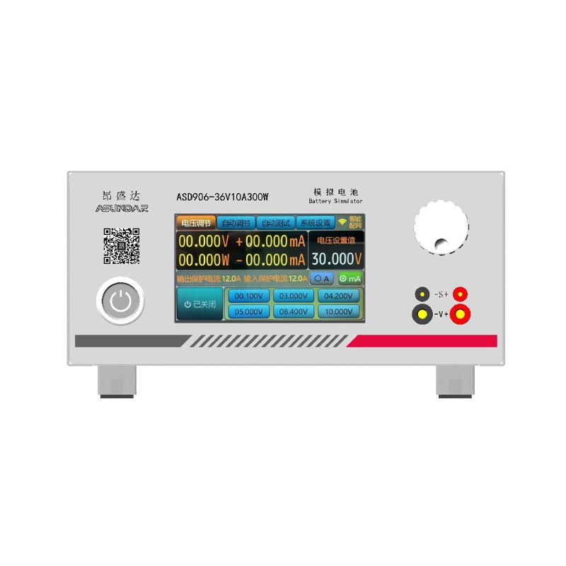 ASD906-36V10A300W 模拟电池 ASD906-36V10A300W模拟电池具有充放电功能,可模拟36V 10A的电池,最大充电30V 10A,最大放电36V 10A,ASD906-36V10A300W模拟电池可模拟电池的充放电现象,从而代替电池对普通适配器或移动电源的PCBA板进行功能或性能测试。主要用于移动电源、适配器、蓝牙耳机、蓝牙音箱等电池充放电产品的开发和实验,也可当作普通可调电源使用。其输入输出电压,和输入输出电流保护值均可设定。可连接PC机通过上位机软件进行远程控制,能设置规定时间内连续变化的动态电压,并能直观显示测试过程中电压电流随时间变化的曲线关系 产品特点 4.3寸高清液晶触摸屏,支持参数直接输入; 增加手动界面模拟上位机测试条件可进行电池电压步进模拟和多点曲线模拟功能; 可通过PC机进行控制,并能设置连续变化的动态电压; 能直观显示测试过程中电压电流随时间变化的曲线关系; 兼具电池的充电和放电功能,支持快速切换; 支持手动调试界面,操作简单,功能全面; 6组电压设定记忆存储功能,可一键调用; 可检测PCBA或成品待机电流; 小电流时可切换至mA档,显示μA级数值; 可选择串口通讯版本(波特率115200); 具有高稳定,低纹波,低漂移特征; 高显示分辨率,电压1mV,电流1μA; 宽电源供电,适用 100~240V 交流电; 技术参数