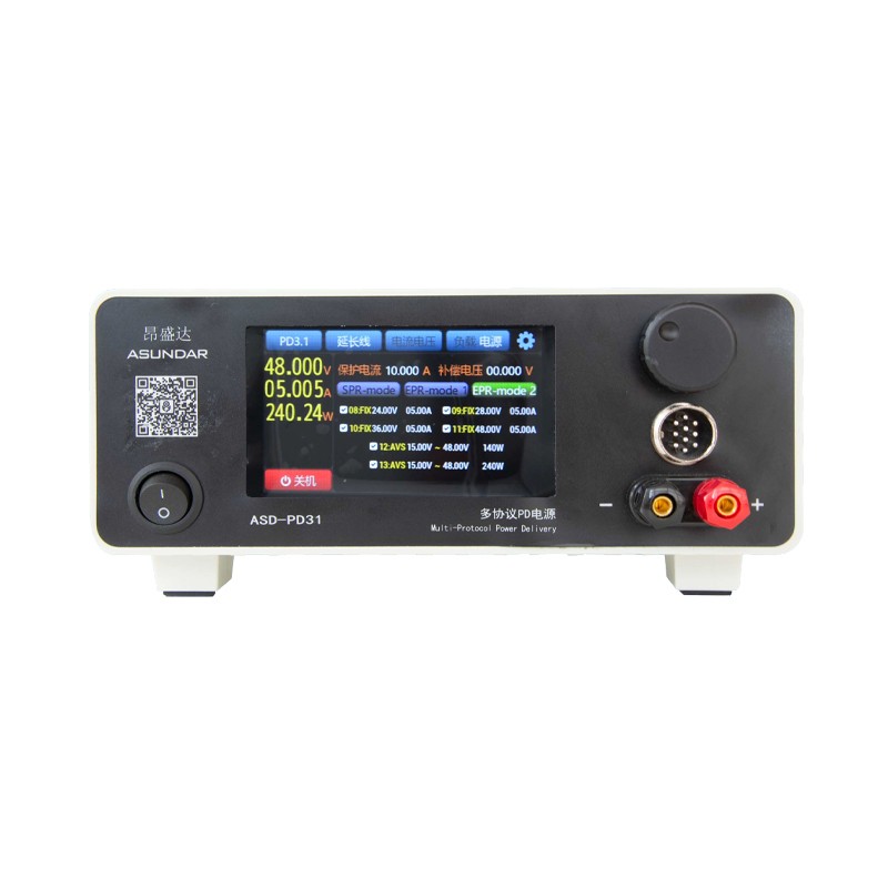 ASD-PD31多协议双向电源 ASD-PD31多协议PD电源在具备普通负载仪和普通电源功能的同时支持QC、PD等多种快充协议的识别触发,主要用于适配器、移动电源、车充等外接电源 PCBA和成品的功能检测、参数测试及性能评估。其最大供电电压48V,电流6A,功率240W。最大带载电压48V,电流10A,功率240W。即可作为QC、PD快充电源对外供电,亦可侦测产品快充协议、电压及电流范围,测试产品过流保护、短路保护等功能。 产品特点 4.3寸高清液晶电容触摸屏,操作简单,功能全面; 作电源时,支持最大输出48V6A240W,兼容PD3.1、QC2.0、QC3.0快充协议; 作负载时,支持最大输入48V10A240W,兼容PD3.1、QC2.0、QC3.0快充协议; 作负载时,另兼容AFC、FCP、SCP、SSCP、VOOC快充协议; 做电源时,可设置保护电流、保护电压及线损补偿电压; 做负载时,可切换恒流方式(CC)和恒压方式(CV); 做负载时,带E-mark功能,短时间非老化测试可带载240W; 可测试移动电源或 USB 适配器PCBA 和成品的输出电压、电流、功率,纹波; 可测试D+、D-数值和Type-C口正反面; 可侦测显示产品的快充协议、电压及电流范围; 可侦测产品输出电流及测试过流保护(OCP)功能; 可测试产品短路保护功能及保护时间; 可测试产品恒流带载到进入保护状态的时间; G20-10航空插座搭配专用测试线材,电流传输和快充协议匹配**兼容; 4mm香蕉插座搭配专用测试线材,低阻抗,利于大电流传输; 高测量精度,电压1mV,电流1mA。 技术参数