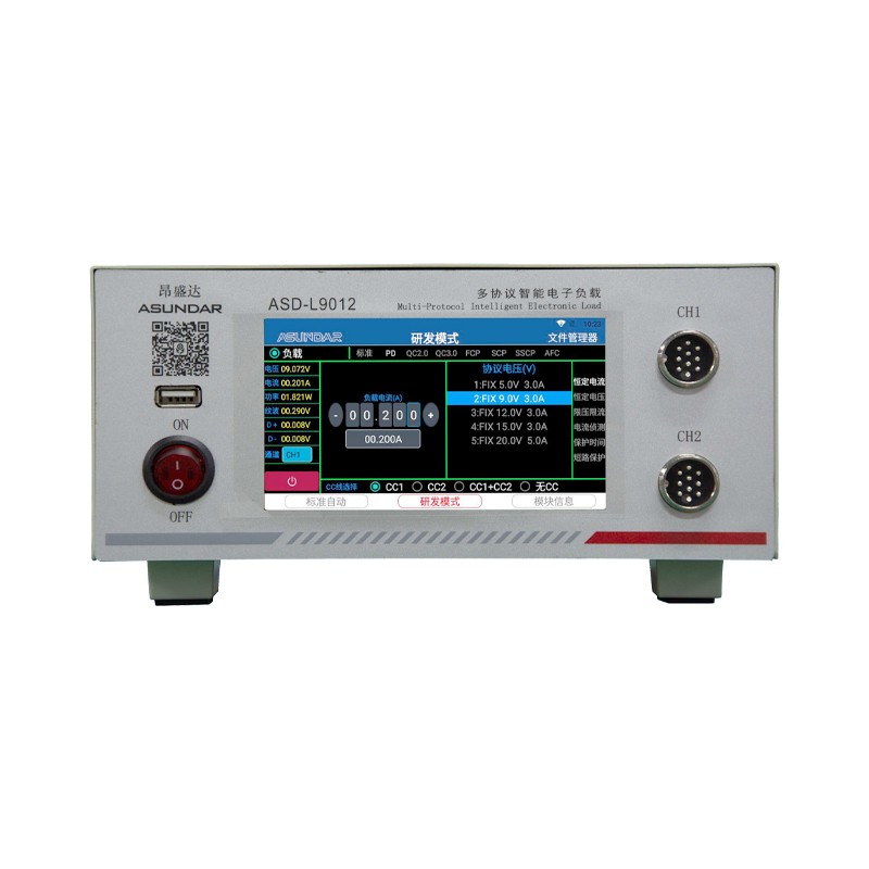 ASD-L9012 多协议单通道可编程智能负载 ASD-L9012多协议智能电子负载集成安卓触摸屏上位机,在具备普通负载仪功能的同时支持QC、PD等多种快充协议的识别触发,主要用于适配器、移动电源、车充等外接电源 PCBA和成品的功能检测、参数测试及性能评估。其最大带载电压20V,电流10A,功率100W。可侦测产品快充协议、电压及电流范围,测试产品过流保护、短路保护等功能。支持手动及自动测试,既适用于研发调试和性能评估,亦便于生产线批量检测使用。 产品特点 5寸高清Android触摸屏,操作简单,功能全面; 支持最大带载电压20V,最大电流10A,最大功率100W; 双通道可切换,能一次测试双口产品; 支持自动测试,编程一键测试多项功能并判定品质; 支持手动调试,各项功能一目了然,快速设置; 兼容PD2.0、PD3.0、QC2.0、QC3.0协议,可快速设置电压电流参数; 兼容AFC、FCP、SCP、SSCP、VOOC、SVOOC协议,可快速设置电压电流参数; 可测试移动电源或 USB 适配器PCBA 和成品的输出电压、电流、功率,纹波; 支持切换恒流方式(CC)和恒压方式(CV); 可测试D+、D-数值和Type-C口正反面; 可侦测显示产品的快充协议、电压及电流范围; 可侦测产品输出电流及测试过流保护(OCP)功能; 可测试产品短路保护功能及保护时间; 可测试产品恒流带载到进入保护状态的时间; 设备上位机和底层程序不定期优化,支持WiFi联网升级; G20-10航空插座,专用测试线材,支持大电流传输,低阻抗; 高测量精度,电压1mV,电流1mA。 技术参数