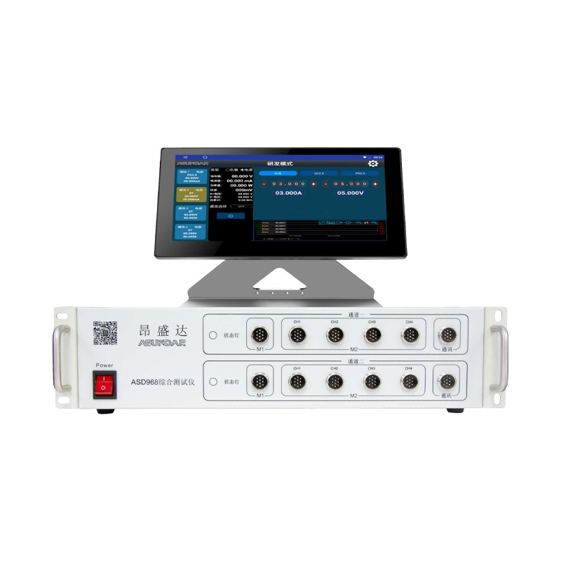 ASD968 多协议多通道多功能可编程综合测试设备 ASD968综合测试仪由测试仪及触控屏两部分组成,主要用于移动电源、适配器 储能电源等外接电源 PCBA和成品的功能检测、参数测试及性能评估。测试仪内部集成两个独立的模拟电池模块对应2个测试接口,两个独立的双向电源模块对应8个测试接口。模拟电池可模拟充电电池的充放电现象,双向电源兼具电源和负载功能且支持 QC2.0 QC3.0 PD2.0 PD3.0 PPS快充协议。单台设备可完成PCBA或成品的大部分功能测试,测试移动电源无需外接锂离子电池,测试快充无需诱骗器、电源、负载等各类设备。支持编程自动测试。支持数据存储、导入及导出,可将测试结果以文档形式导出至USB存储设备。 产品特点 10.1寸高清液晶触摸屏,安卓系统上位机操作界面; 二路模拟电池,二路PD双向电源,支持100W充放电. 支持普通,QC2.0、QC3.0、PD2.0、PD3.0、PPS快充协议; 可同时测试二个4个端口的电源产品 支持研发调试,自动测试 负载有CC CV模式 模拟电池可测试产品静态电流,电流精度μA级 可测试产品的 OCP 短路保护 可测试产品USB输出口的D+、D-值和Type-C正反面; 可测试产品的电源输出纹波; 支持通过USB存储设备导入或导出文件; 支持扫码启动、自动启动,外接触发启动; 上位机应用和硬件底层程序均可联网远程更新; 通迅端口用于可搭配无线充接收头配件测试无线充产品(配件另外配置)。 技术参数