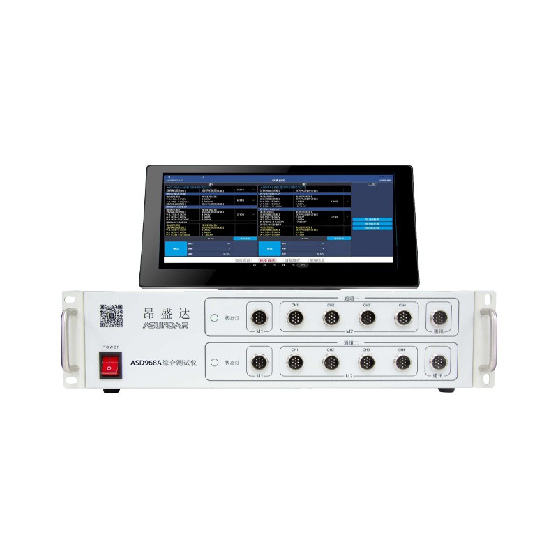 ASD968A 综合测试仪 ASD968A综合测试仪由测试仪及触控屏两部分组成,主要用于移动电源、适配器等外接电源 PCBA和成品的功能检测、参数测试及性能评估。测试仪内部集成两个独立的模拟电池模块对应2个测试接口,两个独立的双向电源模块对应8个测试接口,2个通讯插座。模拟电池可模拟充电电池的充放电现象,双向电源兼具电源和负载功能且支持 QC、PD、华为及三星快充协议。单台设备可完成PCBA或成品的绝大部分功能测试,测试移动电源无需外接锂离子电池,测试快充无需诱骗器、电源、负载等各类设备。支持协议自动侦测,支持编程自动测试。支持数据存储、导入及导出,可将测试结果以文档形式导出至USB存储设备。 产品特点 15.6寸高清液晶触摸屏,安卓系统上位机操作界面; 集模拟电池、快充电源、快充负载于一体; 兼容QC、PD、华为及三星快充协议,可快速设置电压电流参数; 研发模式,可快速设置参数; 标准自动,可一次测试两个产品的多项功能; 混合自动,应用多端口储能产品测试; 可测试产品的充放电电压、电流及功率; 可测试产品的过流保护及静态电流,精确到μA级; 可测试产品USB输出口的正反面D+、D−值和Type-C正反面; 可测试产品的电源输出纹波; 搭配专用无线充接收头测试无线充电器; 支持通过USB存储设备导入或导出测试文件; 支持扫码启动、自动启动,外部触发启动; 上位机应用和硬件底层程序均可联网远程更新。 技术参数