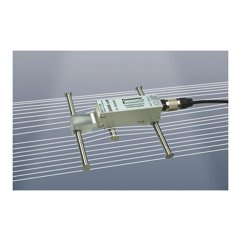 Kett-08 是特殊设计用来测量经纱张力的张力仪. 20mm宽的经纱上受到的合力经张力仪测量后显示到一个独立的显示单元上. 纤细的设计能够测量经纱边缘的张力. 测量位置可选, 可以在运动的经纱上进行水平方向的测量,也可以进行垂直方向上的测量. 额定量程: 20N, 30N (测量宽度20mm). 可以很方便的测量经纱张力. 在测量经纱张力时,张力仪置于经纱上面. 把需要测量的经纱手动的放在张力仪上 显示单元DMS-TENS 显示测量值. DMS-TENS: