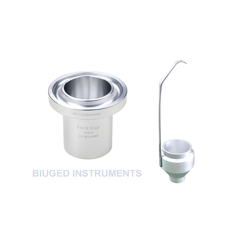 产品说明 福特杯(Ford Cup)按美国材料试验学会油漆及原材料标准ASTM D1200, D333, D365中规定制作,用来测量油墨、涂料、油漆的黏度。它由底部开有小孔,容量约为100ml的优质铝杯精制作而成。福特(Ford)杯通过测定铝杯中一定容量的试料由底部的小孔中流出所需要的时间来评价物料的黏性,在美洲、欧洲国家广泛使用。 产品图片