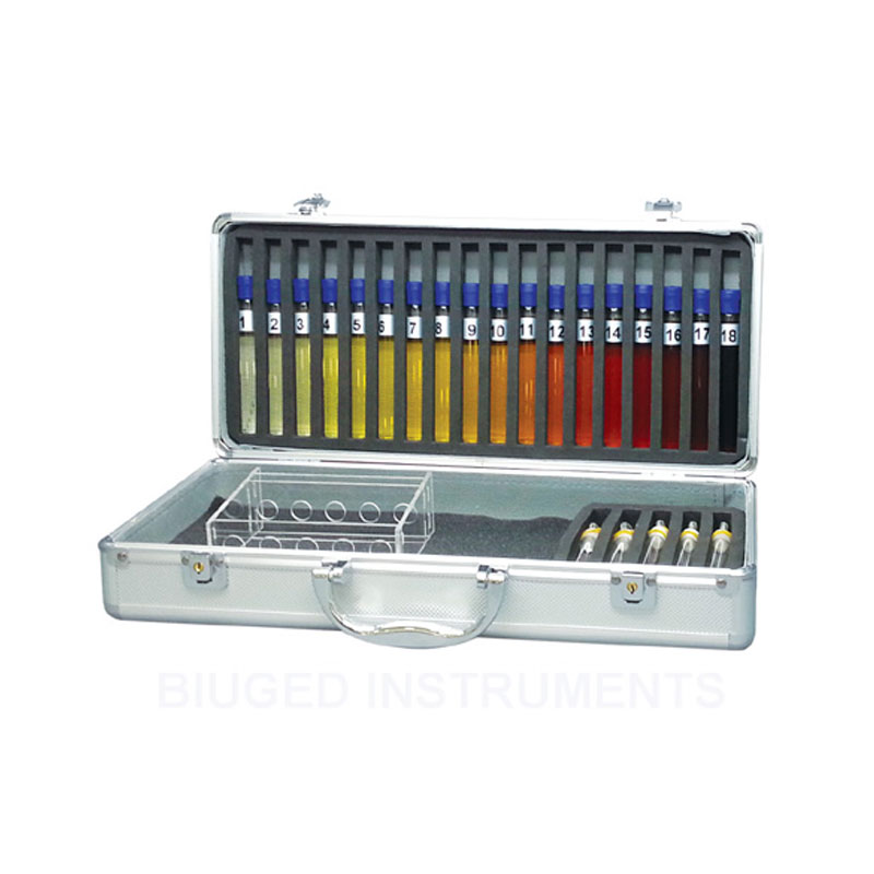 按GB/T 1722设计,在标准光源下,以目视法将试样与一系列有色阶标号的铁钴标准溶液进行比对,以与试样最接近的色阶号表示待测试样的颜色深浅,适用测定清漆、清油及稀释剂颜色。
