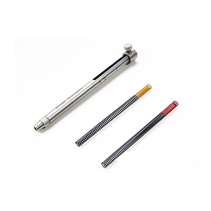 产品说明 硬度试验笔又名牛顿笔,由德国Robert Bosch GmbH发明,设计用于精确地测量和记录各种硬度(如各种涂层的硬度、塑料、木材或者金属等材料表面的硬度),测量表面可为平面或曲面,且不论大小。该仪器携带方便,可装在口袋中,适用于各种场合。 仪器内装一个可调压力的弹簧,压力由滑杆控制,弹簧作用于一个合金钢测试头上,通过定位螺丝固定滑杆,以保证恒定的压力,可选择三种不同压力的弹簧0-20N(2000g),对应刻在笔上的刻度,四种压力量程包括: No.1 0-3N(0-300g) (蓝色) 间隔:0.1N(10g) No.2 0-10N(3-1000g) (红色) 间隔:0.5N(50g) No.3 0-20N(0-2000g) (黄色) 间隔:1N(100g) (每一根与压力量程对应的弹簧具有与刻度相应的颜色代码) 通过滑杆可设置估计或已知弹簧压力。将仪器垂直放在测试表面,以10mm/秒的速度划一条直线。测试头会产生一条仅肉眼看得见的划痕。如果弹簧压力太高,划痕会很清晰,如果弹簧压力太低,将没有划痕出现。通过锁定滑杆每次可以控制所需的压力,单位为牛顿(Newtons). 技术参数