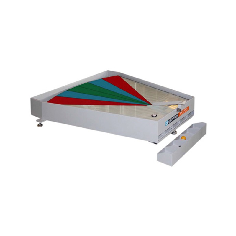 用标准钢球和水平仪将扇形玻璃校正至水平,将样球以两顶端为转轴,放在斜形槽板顶端紧贴基准面,自由滚下,球在出口处所测得的偏离中心线距离为该球的偏心度。