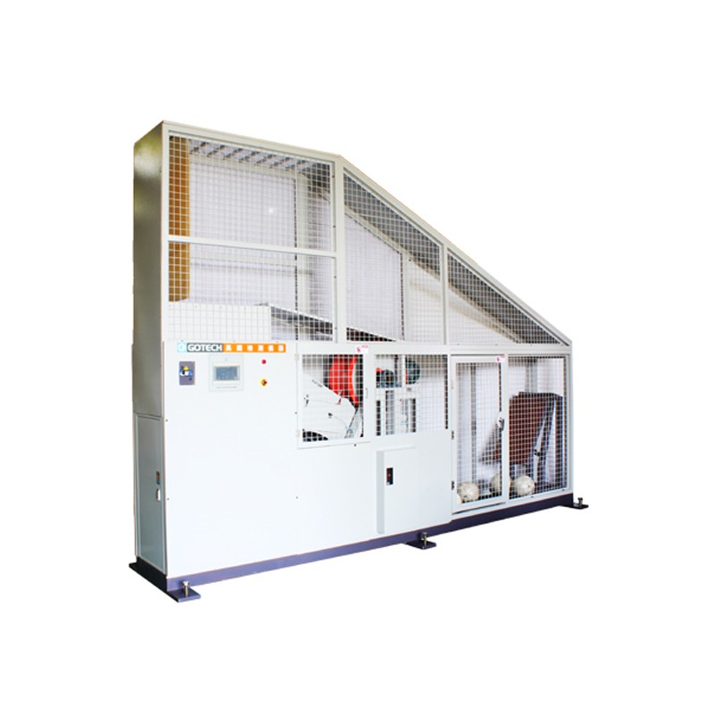 本试验机适用于测试篮球、足球、排球、手球动态耐冲击性能。利用上下相对的两个高速旋转的鼓轮,在摩擦和挤压的作用下将试件高速抛出,冲击回弹板,回弹板将试件回弹到接球漏斗内,在重力作用下传到抛射鼓轮处,再次将试件抛出。经过设定次数的测试后,检查试样内压力变化,以及是否破裂、内爆、脱皮、脱胶、断线、变形等现象。 采用先进的PLC可程序设计控制器作为电气控制系统。使用高清晰大型彩色触控式屏幕,进行工作状态控制、数据采集、运算处理等项目。具有资料打印存储功能。 产品规范 GB/T 14625.3 产品规格