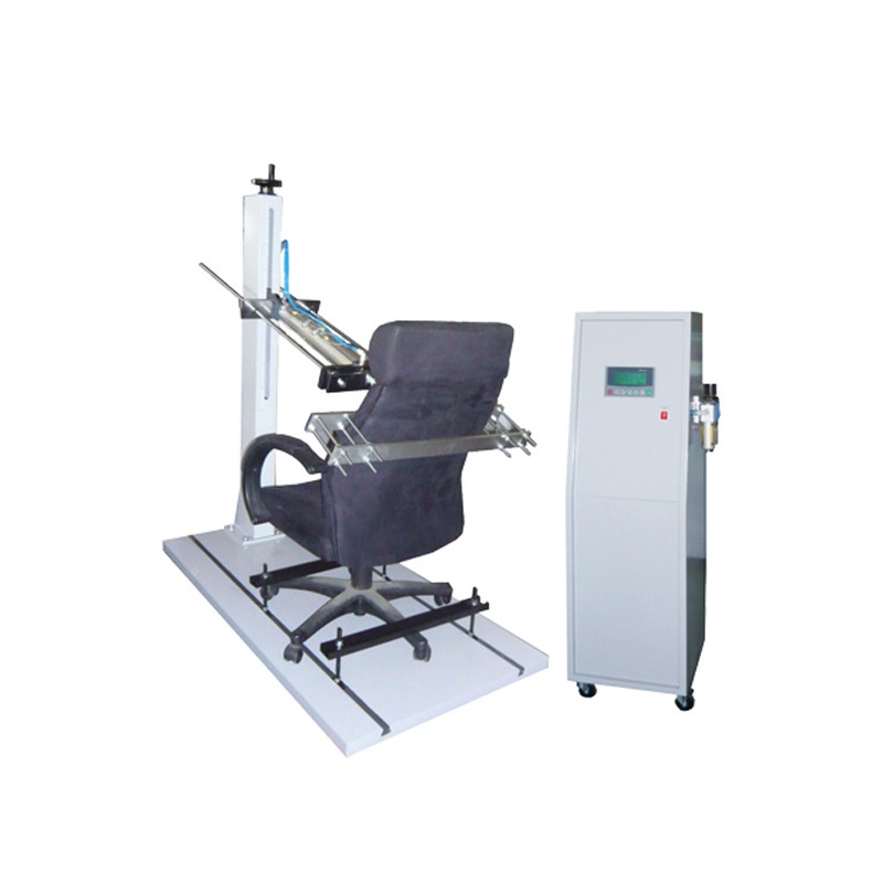 固定办公椅之脚轮 ,座面施加负重 ,对办公椅靠背以一定力量、方向、行程、速度及规定次数作反复靠背动作,以评估产品之品质。 产品规范 ANSI/BIFMAX5.1 产品规格 容量 | 200 kgf | 测试高度 | 500~1200 mm (可调) | 往复行程 | 0~400 mm(可调) | 负重砝码 | 100 lb 或 225 lb | 制动方式 | 气动 | 角度 | 0~45°(可调) | 往复速度 | 10~30 次/分(可调) | 计数器 | LCD, 0~99,999, 999(可设定) | 试件型式 | 活动式椅脚/固定式椅脚 | 体积(W×D×H) | 主机:80×171×177 cm ; 控制箱:45×40×124 cm | 电源 | 1∮, AC 220V(依国别或指定) |
