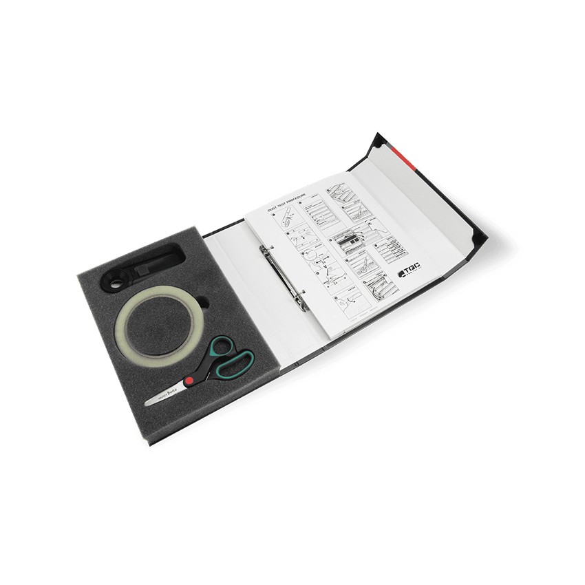 TQC Sheen 表面粉尘测试套装用于验证表面是否适合涂装油漆、油墨和涂料。使用符合 BS EN ISO 8502-3 的测试和检查解决方案,快速准确地评估存在的灰尘颗粒的数量和大小。 这款全面的表面粉尘测试套装包含您所需的一切,包括带有灰尘比较显示板的耐用活页夹、灰尘评估 板、照明放大镜、胶带和一套测试记录表。 粉尘测试的重要性 喷砂清理表面上的灰尘会降低涂层附着力,导致涂层过早失效和涂层表面不达标。使用此款TQC Sheen方便的灰尘测试套件,能有效优化 QA 流程,确保最终涂层和产品符合要求。 表面粉尘测试套件可根据 BS EN ISO 8502-3 的建议用作通过/失败测试或作为粉尘存在的**记录。 为什么选择 TQC Sheen粉尘测试套件 选择这款实用的粉尘测试套件有很多理由,其中包括: 耐用性和便携性 这款综合套件存放在一个坚固的活页夹中,里面装有所有必要的表格和目视比较器,并配有一个用于放置胶带、剪刀和照明放大镜的内置隔层。活页夹采用 Velcro 胶带封闭,以固定内容。 清晰的展示板 展示板清晰地显示了不同的数量等级,还具有独特的浅色和深色灰尘颗粒尺寸比较器。其中还包含一个黑白对比文件。 便捷的报告表格 随附的报告表格提供了 5 种不同测试结果的空间。ISO 8502-3 标准要求的所有信息都可以使用复选框或预定义区域填写。这保证了报告的完整和有效。 图解手册 图解手册清晰地展示了测试方法,并且可以使用任何“语言”来使用。 耐用的样品转移板 样品转移板由耐刮擦、高透明度塑料制成,带有预印位 置。它由 Velcro 条方便地固定,易于拆卸和更换 玻璃放大镜 照明放大镜具有真正的玻璃镜片,视野清晰,无划痕 符合测试灰尘测试套件标准 我们知道,在测试流程或产品时,确保能够满足常见的行业标准非常重要。TQC 光泽粉尘测试套件是根据 ISO8502-3 设计的,该套件是广泛接受的测试平均粉尘量的标准,以及用于评估基材上粉尘颗粒平均大小的描述性类别。它还可用于测试 ISO 8503-01。 功能和优点