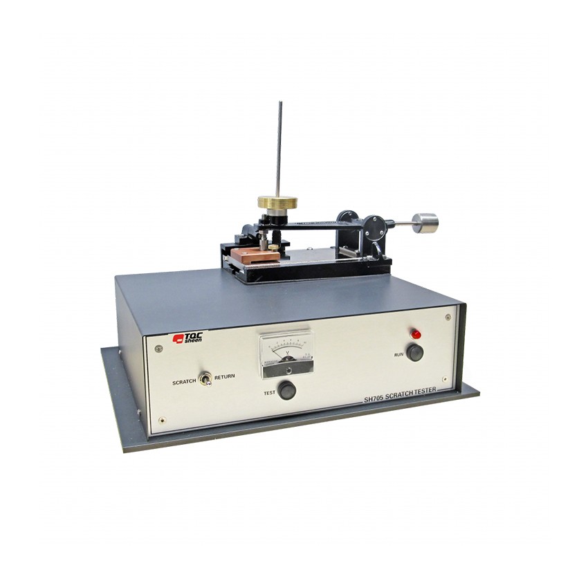 TQC Sheen 机械划痕试验仪,主要是用于基于抗划伤性方法的涂层硬度评估,符合ISO 1518-1、GB/T 9279.1-201 标准要求。 TQC Sheen 机械划痕试验仪,又称耐划伤仪、涂层表面耐划伤仪、耐划痕试验仪等。主要是用于基于抗划伤性方法的涂层硬度评估。TQC Sheen 机械划痕试验仪原理是将测试板夹紧并缓慢移动,同时用触针或替代工具刮擦表面。根据测试程序,可以应用指定或可变载荷以获得从痕迹到破坏的不同程度的失效。 该仪器配备一个机盖,罩着齿轮和其它部件,用于以恒定速度(每秒3-4 cm )操作滑块和测试臂提升机构。测试针的支撑臂受力平衡且为刚性结构, 可以防止在球面测试区域抽动或颤动。 机械式划痕仪配备一只1mm的碳化钨球头针(通常随每台仪器一起提供)以90 º 的角度固定在测试板的卡盘中,可以很容易地拆下进行检查和更换。 碳化钨针将确保安全、长效的使用寿命,而无需在每次测试之后更换尖端。配备100g至2kg(0-20N)的可选附加重量,装载在球头针(或触针)上方,对于更硬的涂层,可选最大10kg的附加重量附件。 可使用厚度高达1.65毫米的150 x 100毫米标准试板(通常为金属质地),但如有要求,可提供更厚的试板。 可提供塑料防护罩,以避免损害或伤及机械装置,避免仪器启动时发生危险。 机械化划痕试验仪供货范围: