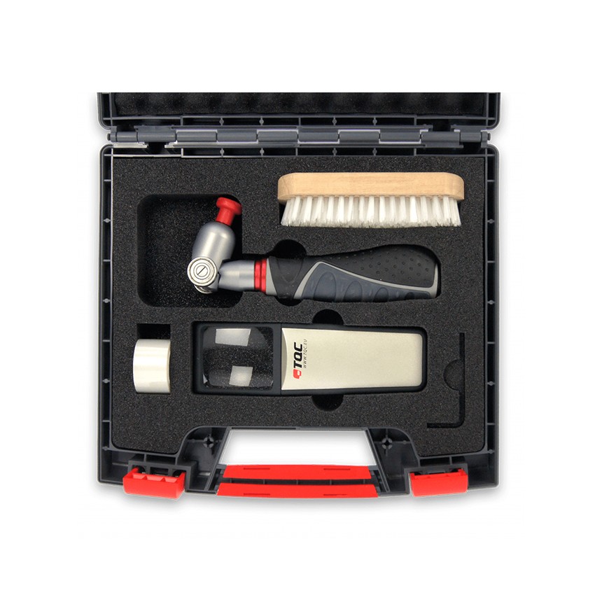 划格法是一种测量表面干燥涂层附着力的一种测试方法,运用TQC Sheen划格法附着力仪在两个外导线之间的一排6/11个刀片,划出25/100个方格,再通过对比格定出评价等级,齐全的刀具尺寸可根据标准用于不同的涂膜厚度和底材,每一套附着力测试仪都由轻质、舒适的手把,坚韧的刀具组成,还包括刷子,小型放大镜,胶带。 TQC Sheen 划格法附着力仪主要有CC1000,CC2000,CC3000三种型号。 TQC Sheen CC3000 可调划格法附着力仪固定器在涂膜表面和两个辅助轮之间保持固定的距离,以测量厚度达 250 µm 的涂层。切割深度可以精确调节,保证重复试验的结果。 功能和优点