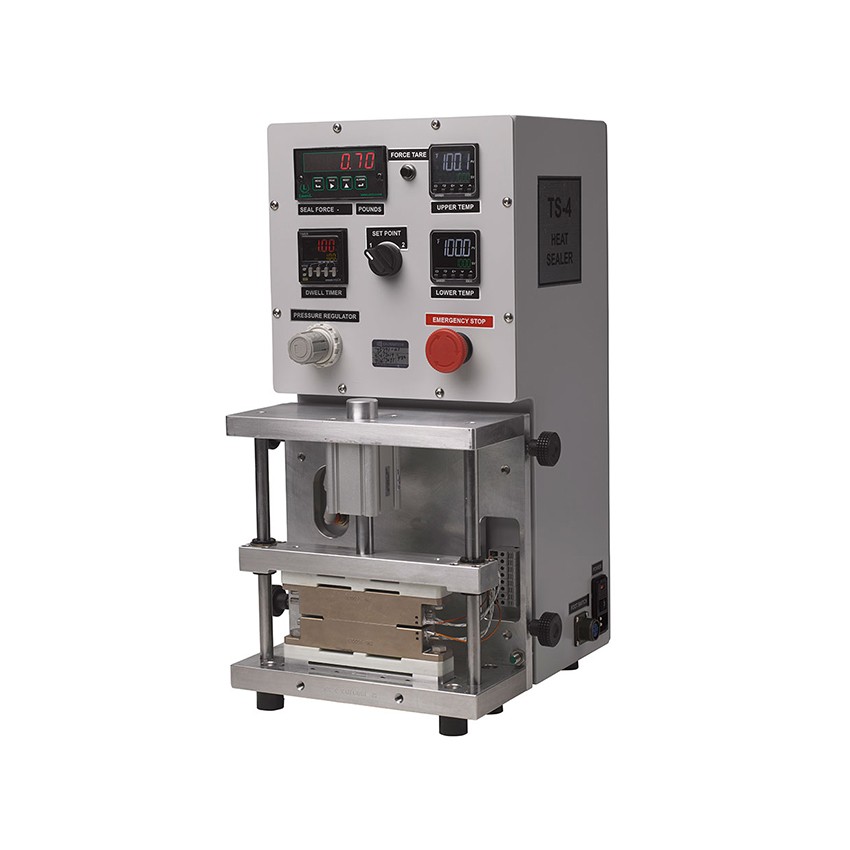 TMI 75-59 TS-4 实验室热封测试仪,用于制备热封样品,以测量软包装薄膜、薄膜箔层压板、无纺布和其他基材的密封强度。 TS-4 热封测试仪采用精密称重传感器系统,测量并显示施加在薄膜样品上的总力,从而使密封一致且精确。集成数字电子控制器显示密封力、热封时间和上下夹具温度独立控制。 75-59 TS-4 配有可互换密封夹具,该装置可与快速更换的可互换夹具一起使用。 可选密封夹具(单独出售): 一套快速更换上下密封钳口,25.4×101.6毫米 (1×4英寸) (钢覆涂层),其他尺寸可选 一个上部快速更换的钢涂层夹具和一个下部快速更换的聚合物密封夹具,25.4×101.6毫米 (1×4 英寸) 一套快速更换的上下密封钳口,带特殊图案 可选薄膜样品装载装置: 货架薄膜样品托盘: