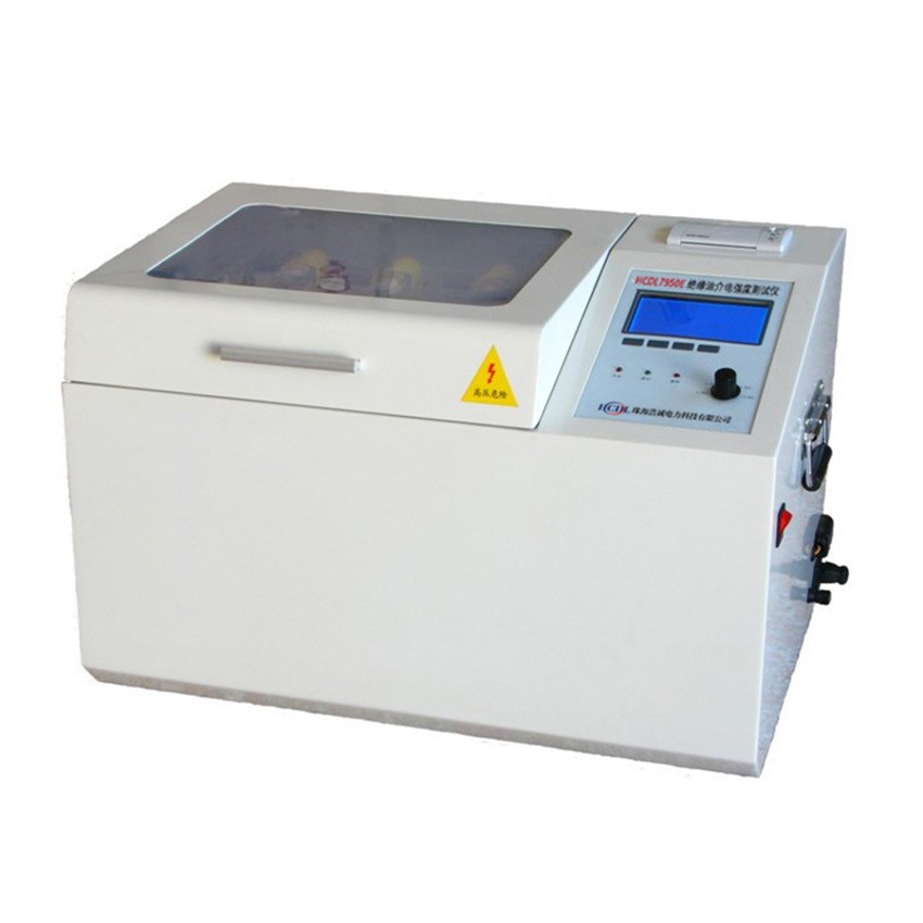 HCDL7950E 绝缘油介电强度测试仪 一体式结构设计,便于操作和携带 5.4²液晶显示屏,中文菜单人机对话方便,具有温度、湿度测量以及时钟显示功能 操作简单,自动完成升压、保持、搅拌、静置、计算、数据存储及打印输出等操作 具有断电存储功能,可自动保存测试结果 具有过压、过流、限位及接地报警功能,以保障操作人员的人身安全 独特的波形整定功能,消除谐波对准确测定的干扰 采用CPU和PLC双重控制,保障仪器工作稳定可靠 具有仪器自校准功能,可以保证数据的准确性 高压输出端选用弹压结构,保证油杯与高压输出端的紧密接触 程序设有GB/T507-1986/GB/T507-2002以及自定义程序可选,选择性灵活 具有232接口和蓝牙功能,方便与电脑传输数据