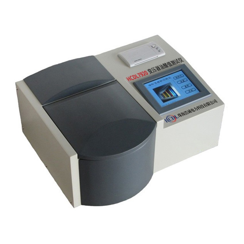 HCDL7920 变压器油酸值测试仪 一体式设计,适用于变压器油、 汽轮机油酸值的测试 自动完成萃取剂加入、中和滴定及终点判别、酸值计算、数据保存及打印输出等操作 不必自行配制萃取液、中和液等工作溶液;油样平均测试时间为2分钟左右 6²全中文电阻式触摸显示屏,色彩鲜艳雅致,参数输入响应准确,显示性能稳定可靠 断电存储功能,可存储最近的100个测试结果 标准酸自动校准功能,最大限度地消除系统误差,保证测定结果的准确度 大容量高效二氧化碳、水净化系统,保证中和液浓度的稳定性 机箱设计结构简约合理,体积小巧玲珑,外观典雅大方 设有USB输出功能方便与电脑联机
