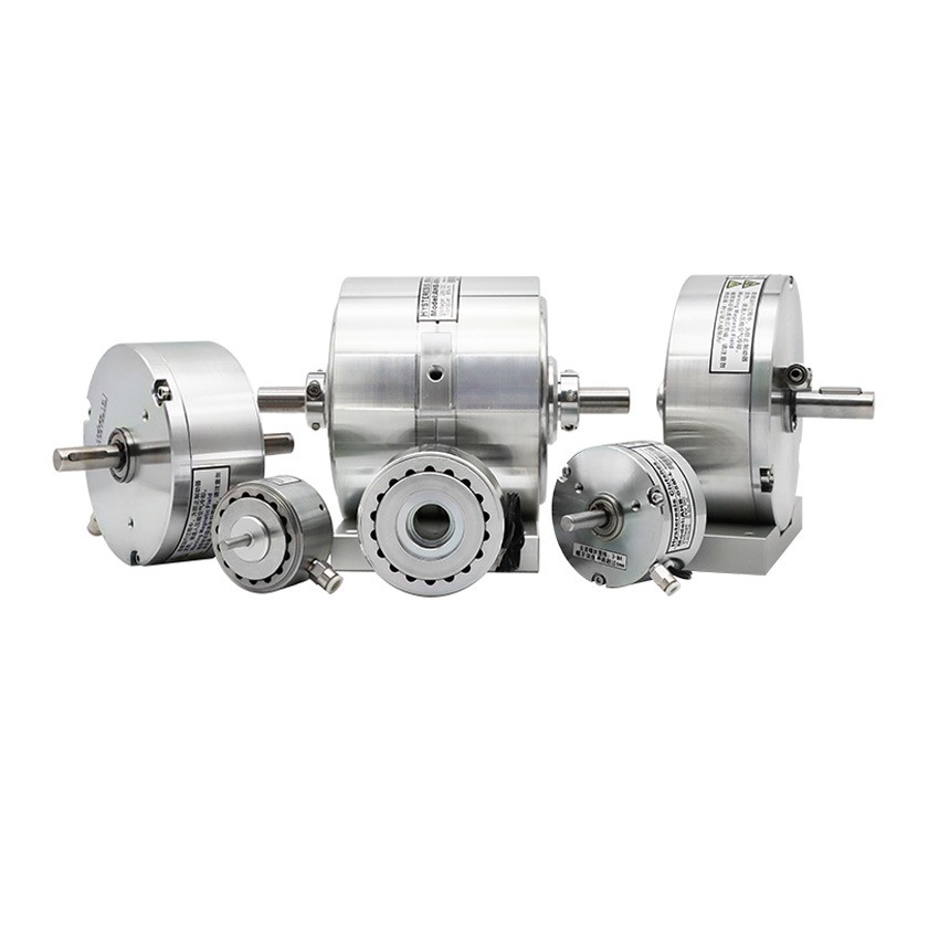 产品外形尺寸请咨询销售人员磁滞制动器产品型号定义: 例:HB-002M-D HB:标准型磁滞制动器 LB:空心轴磁滞制动器 AHB:气冷型磁滞制动器 MHB:匹配型磁滞制动器 002M:型号规格 D:双出轴 L:左出轴 R:右出轴 1、HB标准型磁滞制动器 标准型磁滞制动器有单出轴与双出轴两种安装方式,根据使用空间、安装形式选择,应用范围广,通用性强。主要应用于高速绕线设备、电机、小型内燃机、齿轮箱及其它旋转装置的寿命实验的模拟负载,高端运动器材的精确负载。 2、AHB气冷式磁滞制动器 磁滞制动器内置冷却孔,外接压缩空气冷却。当制动器长时间工作时,会使其温度急剧升高,气冷式磁滞制动器可在滑差功率下长时间连续运转。 3、LB空心轴式磁滞制动器 空心无轴式装配,转子面加工安装孔,嵌入式公共轴安装方式。为线材被动放卷提供恒张力控制,适用于电缆包覆层扎纱放带等螺旋缠绕场合。如电线电缆、光纤电缆、绳索和胶管等生产设备。 4、MHB匹配式磁滞制动器 在多个电流特定点其扭矩都是相同的,仅使用一套控制系统即可实现多轴张力控制。主要用于多卷纱线、玻纤放卷装置及电缆、绳索等加工机械。 产品特点