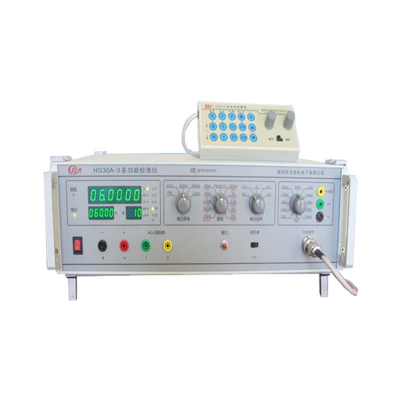 HG30A-3型多功能校准仪是智能化交、直流标准电压、电流校准仪(其中交流输出为真有效值显示)。仪器设有三个显示窗口,可同时显示输出实际值、百分比和被检表满度值。可设根据被检表满度值设置仪器的输出量程,并可根据被检表的刻度选择相应的步进量。输出调节可选择键盘(按键)控制或电位器控制。具有数字显示、误差直读、量程宽、分档细、精度高、稳定性好、使用方便等特点。适用于检定、检验、维修四位半数字三用表、各种0.2级、0.5级以下指针式交、直流电压、电流表;亦可作为高稳定度测试电源使用,配合高等级标准表,校对0.1级电流、电压表。 主要功能 1 、5 1/2位LED数字显示输出量 ,按实际值和百分比两种方式同时显示。 2 、采用键盘控制输出量的增减。键盘控制量分为100%/N、10%/N、1%/N、0.1%/N(N为4、5、6、10、15)。 3 、外控调节器可以离机控制输出量的增减,调节器上有键盘和电位器两种配置,任意转换。 4 、交、直流电压输出范围为0~1050V。 5 、交、直流电流输出范围为0~25A。 6 、交流提供四种输出频率:50Hz、60Hz(59.7Hz)、400Hz、800Hz、1200Hz,使用晶振保证频率的准确度和稳定性。 7 、输出超载能自动保护,手动复位。 8 、交流50Hz输出还可以选择市电同步,以减小被检表的拍频影响。 9 、钳形表测量功能:配用本厂标准线圈,可测量0~1000A电流,误差±0.3%。 技术性能 1 、稳定性: AC<满量程的0.02%/5分钟 DC﹤满量程的0.01%/5分钟,作精密测量时仪器需预热两小时。 2 、交流失真度:<0.5% 3 、直流纹波系数:<0.05%(额定输出时) 4 、输出频率准确度:50Hz、60Hz(59.7Hz)、400Hz、1KHz<0.1%(或市电同步) 5 、输出电压、电流以及中值电阻的范围及准确度见(附表1)(23℃±2℃,输出值大于10%量程)