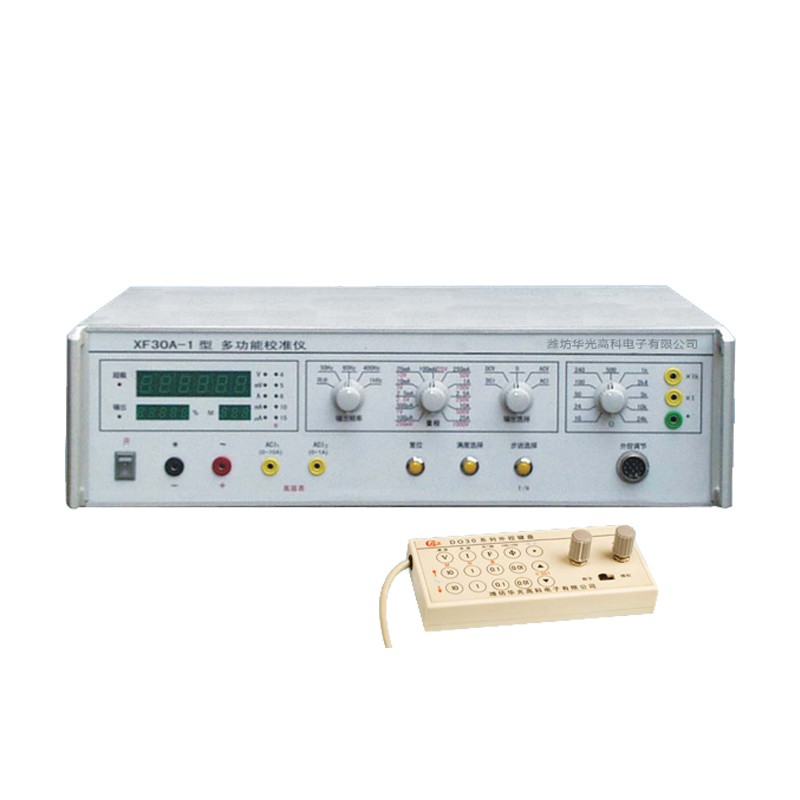 XF30-I型直流多功能校准仪适用于检定、校验各种0.5级以下直流电流、电压、功率表。亦可作为高稳定度测试电源使用,配合高等级标准表,校对0.5级以上直流电流、电压、功率表。配用标准测试线圈(选购件),可以校验1级以下直流钳形电流表。 主要功能 1、五位LED数字显示输出量 2、直流电流输出范围为:0~ 30A,分11档,分辨率为0.01uA 3、直流电压输出范围为:0~1000V,分11档,分辨率为0.01mV 4、功率测量范围为:0~30kW,分辨率为0.0001W 5、输出超载能自动保护,手动复位 6、每档电压、电流可以过载10% 技术性能 1、稳定性:电压<满量程的0.01% / 3 分钟; 电流<满量程的0.02% / 3 分钟 2、直流纹波系数:<0.1% 3、输出电压、电流、功率范围及准确度( 23℃± 2℃ ,输出值大于10%量程)