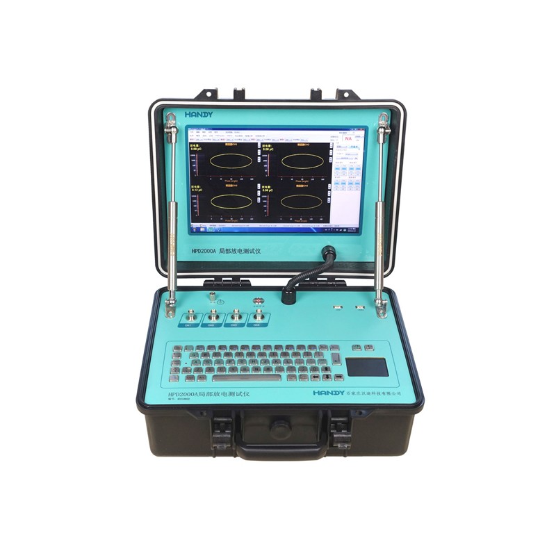 HPD2000A、HPD2000B局部放电综合测试仪采用脉冲电流法测量高压电气设备局部放电量。适用于定量测量高压电气设备局部放电试验。仪器箱使用耐磨防尘防护箱,具有坚固耐用、便于携带的特点。 主要功能 1. 采用脉冲电流法测量电气设备局部放电量。 2. 具有内、外两种同步方式。 3. 超宽动态范围自动增益调节 4. 具有椭圆、直线、正弦时域图。方便观察放电发生的相位和时间。高速数据处理不丢帧。 5. 任意组合带通滤波器设计,确保选择**通带。 6. 绘制放电量与试验电压关系曲线,可以准确判断放电起始电压以及熄灭电压。 7. 具有PRPS图谱。使用3D渲染技术,将放电量、放电相位以及放电时间在时间轴上呈现。 8. 具有PRPD图谱。放电相位,放电重复率在时间上做长时间的积累,极大地降低了判断放电类型的难度,可切换为对数轴,增加了微小放电量分析的容易度。 9. 具有实时频域分析(RTSA)功能。可切换量程1MHZ或10MHZ,特有的余晖模式以及光谱模式,用于准确判断放电发生的频率范围,以及干扰信号频率范围。 10. 内置紧急备用电池,断电自动启动关机程序,保护计算机主板。 11. 内嵌工业金属全键盘及触摸鼠标 12. 超大13.3寸全彩LED高亮工业显示屏,低温性能良好 13. 内置Wi-Fi可连接互联网。实现专家远程操控主机,提供实时测试服务。 14. 可自动生成word格式试验报告。 技术参数