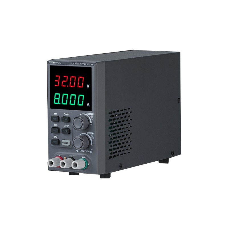 简要介绍 HY1310是高品质, 高稳定性的经济型直流稳压电源, LED四位电压、电流显示,具有过压保护(0VP)、过流保护(0CP)、过温保护(0TP) 等功能,0VP/0CP值可根据使用者要求设置。极高的稳定性、极强的可靠性使得它成为应用于各大院校及企业生产线、家电维修单位等场景的理想工具。 产品特点 额定输出电压:0~32V 额定输出电流:0~10A 设置分辨率:10mV/1mA 四位电压/电流高精度显示 过压及过流保护 键盘锁定 三组设置存储/调出 独立输出开关 编码器调节 测量应用 生产线工作台常规测试及维修 研发和设计验证通用测试 教学实验室 技术指标