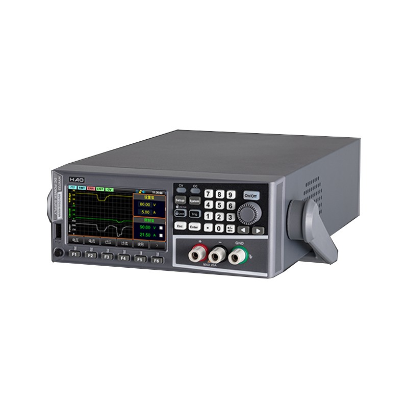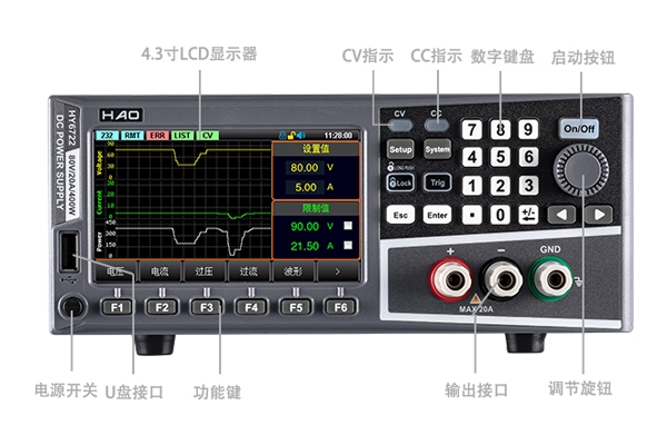 简要介绍 HY6722可编程直流电源是常州浩仪新推出的一款宽范围开关电源。该机型具有体积小、重量轻的特性,采用液晶屏,参数直观,操作快捷,非常适合复杂的生产现场、实验室、产品研发等场合。 产品特点 80V/20A/400W功率输出 采用4.3寸 TFT-LCD显示,简洁面板操作 高精度低纹波 过压、过流、过温保护 远端补偿功能 列表、延时器功能,模拟多种带载情况 电压电流功率波形显示 风扇智能调节 丰富的接口:RS232、RS485、LAN、USB Host、USB Device 支持SCPI/MODBUS协议 优盘接口升级程序 测量应用 自动化测试系统 产品研发调试 实验室 教学实验 手机家电维修 面板介绍