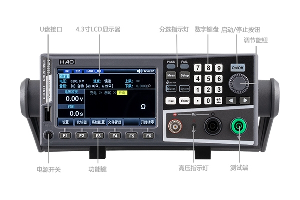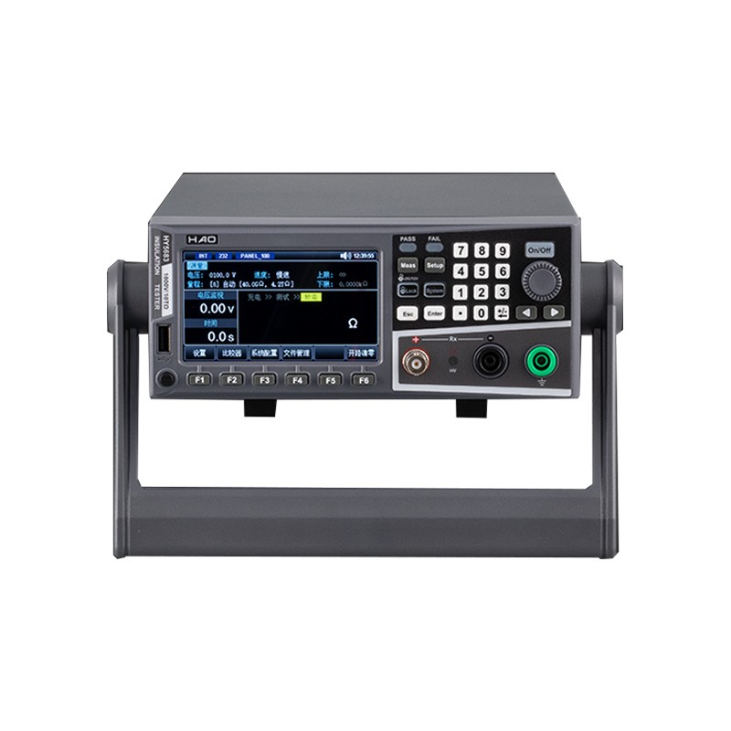 简要介绍 HY5683绝缘电阻测试仪采用高性能处理器控制,4.3寸 TFT-LCD显示。输出电压可任意设置1V~1000V,满足大部分测试需求。六量程测试,绝缘电阻测量范围可达10kΩ~10TΩ,高达30ms/次的采样速率,丰富的通讯接口,为自动化生产提供了优选测试解决方案。 产品特点 采用4.3寸 TFT-LCD显示,简洁面板操作 输出电压实时监视 绝缘电阻、漏电流双显示 充电时间、测试时间、放电时间可调 校正功能,全量程开路清零 针对容性材料的接触检查功能 选择位数显示功能 (5位/4位) 比较器功能,实现合格、不合格分选 分选判断音设置功能 快速放电功能 U盘数据记录 可存储100个测试文件,支持U盘文件存取 接口丰富,支持SCPI和MODBUS两种协议 测量应用 超高值电阻器 各种介质绝缘材料、设备和电线电缆 安规要求的绝缘测试 自动化测试系统 电容器绝缘电阻 面板介绍
