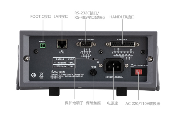 技术指标 测量参数 | 绝缘电阻、漏电流 | 输出电压 | 程控1V~1000V(DC): 电压≥10V时 调节步进1V 电压<10V 时 调节步进0.1V | 电压精度 | 电压≥10V时 1%±1V 电压<10V时 10%±0.1V | 测量范围 | 电阻:10kΩ~10TΩ 电流:1mA~10pA | 测量精度 | 1V ≤ 电压<10V | 5% (小于1M);1% (1M~100M);5% (100M~10G); 10% (大于10G); | 10V ≤ 电压 ≤1000V | 5% (小于1M); 1% (1M~1G); 3% (1G~10G); 5%(10G~100G); 10%(100G~1T);15%(大于1T); | 测试速度 | 快速:30ms/次,中速:100ms/次,慢速:500ms/次 | 量程方式 | 自动、锁定、标称(根据比较器设置选择**量程) | 最大充电电流 | 25mA±5mA | 显示结果 | 电压、电流、电阻、分选结果、声光报警 | 触发方式 | 内部触发、手动触发、外部触发、总线触发 | 充电时间 | 0~999s | 测试时间 | 0~999s | 放电时间 | 0~999s | 比较器功能 | 1组记录,判断上超(UFAIL)、合格(PASS)、下超(LFAIL) | 校正功能 | 全量程开路清零 | 显示 | 4.3寸 TFT-LCD | 存储与接口 | USB HOST | 有(最大支持128G U盘) | 文件管理 | 可保存100个测试设置文件,支持U盘文件存取 | U盘数据记录 | 有 | 控制接口 | HANDLER ,FOOT | 通讯协议 | SCPI , Modbus RTU | 通讯接口 | RS232C , USB HOST , LAN 选配RS485 | 订货信息 | 标准配件 | HY106:RS232通讯线 HY507:高压测试夹 |