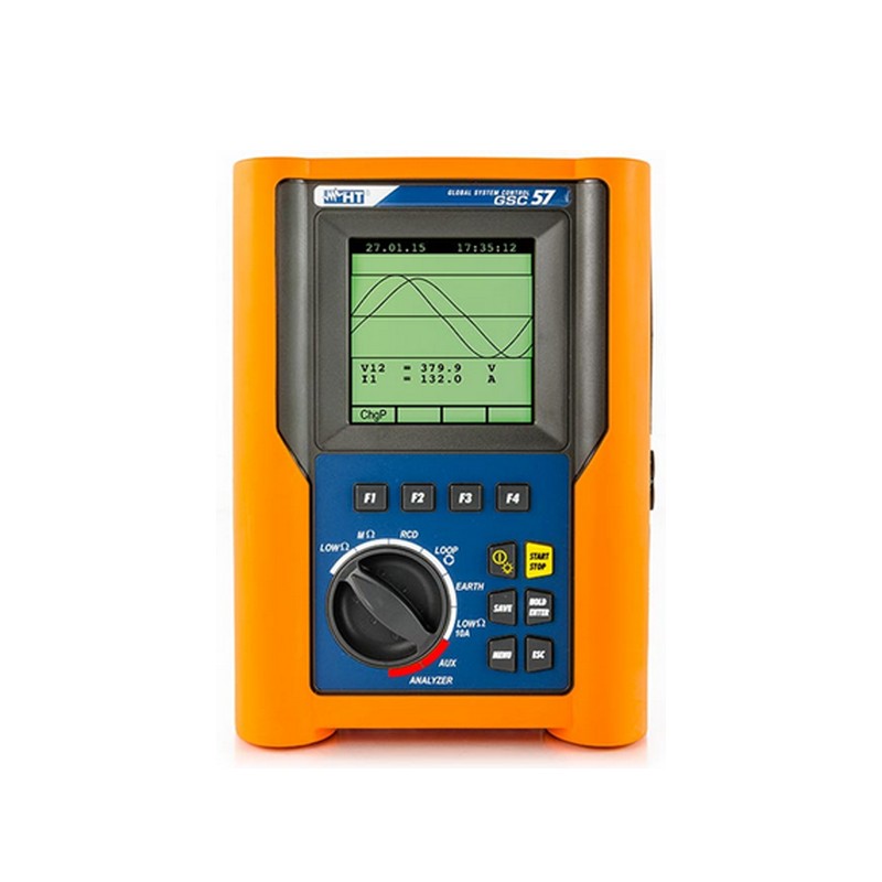 GSC57F是意大利HT公司生产开发的一款多功能的测试仪表。它能按照最常见的安全标准(IEC 61557,VDE 0100,BS7671)对电力设备执行完整的电力安全测试和检验;也能对通用电气系统进行电能质量分析。 具有双重绝缘的特性,执行:低压电气系统的检验;电源的测量以及质量分析;电源干扰;环境参数的测量和分析等。 技术参数 保护导体的连续性(通断性)试验 | 开路 | DC4 | 测试电流 | >0.2A(R<5) | 测量范围 | 0.01-99.9Ω | 基本精度±2%读数 | ±2%读数 | 试验电缆电阻的补偿 | 绝缘电阻测量 | 测试电压 | 5,1,250,500和1000V直流电 | 测量范围 | 0.01-99.99MΩ,测试电压50V直流电 | 0.01-199.9MΩ,测试电压100V直流电 | 0.01-499MΩ,测试电压250V直流电 | 0.01-999MΩ,测试电压500V直流电 | 0.01-1999MΩ,测试电压1000V直流电 | 基本精度 | ±2%读数 | 差动保护(A、AC、一般和选择型)的跳闸时间和电流检验 | 跳闸电流 | 10-30-100-300-500mA | 跳闸电流斜坡 | 0.5-1.4Idn,AC型 | 0.5-2.0Idn,A型 | 跳闸时间测量 | ½Idn-Idn-2Idn-5Idn和自动 | 基本精度 | ±10%读数 | 测量接地电阻和接地电阻率 | 通过辅助极测量接地电阻 | 0.01-1999Ω | 通过4线法测量接地电阻率 | 0.01-199.9k-Ωm | 测量TT系统插座的接地电阻 | 电压降 | 基本精度 | ±2%读数 | 相序测量 | 电压 | 10-400V | 直接测量对地泄漏电流 | 使用电流钳,范围为0-1A;分辨率=1mA | 精度 | ±2%读数 | 按照标准EN50160的要求检验电能质量 | 可测量电压 | 高达600V | 用电流钳测量电流,输出1V | 频率 | 5-6Hz | 精度(仪表) | ±0.5%读数 | 精度(瞬时) | ±1%读数 |