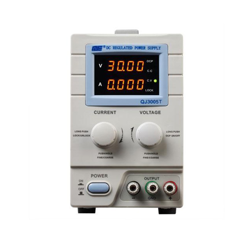 QJ3005T 直流稳压电源 1、输入交流电压 AC220V 50HZ 2、采用单片机控制,成熟数字电路设计,SMT 贴片生产工艺。 3、电压、电流设置采用更可靠的编码器调节,能更精准的快捷操作。 4、四位数码管LED 显示电压、电流值。 5、高稳定度,低温漂,稳压稳流自动转换。 6、Lock 按键锁功能,锁定输出值,预防误操作。 7、限流保护功能,可预先设定限流保护值。 8、过流保护功能,可预先设定过流保护值,能及时关闭输出,保护负载的安全。 9、过热保护功能,当散热风扇不转,调整管过热时会及时停止工作,避免烧坏。 10、智能散热系统,散热风扇转速跟随输出功率大小而自动调整,有效降低风噪。 11、常温条件下可连续满负载工作 技术参数