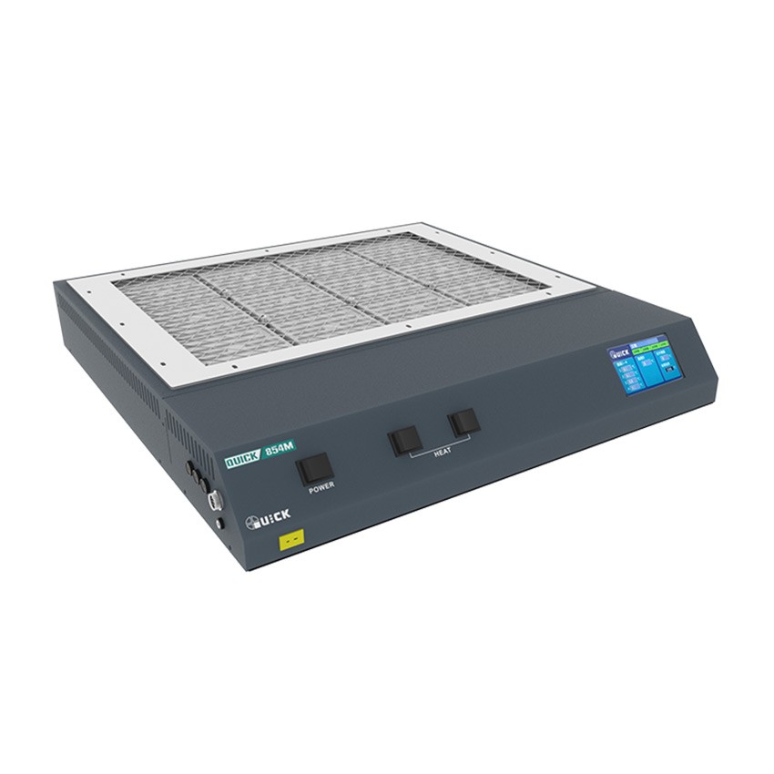 854M 红外预热台 产品特点 1. 红外陶瓷加热体,加热快、效率高、寿命长。 2. 温度控制采用 K 型热电偶,闭合回路过零触发控制,数码管显示,操作简单直观。 3. 使用三只开关分别控制电源及加热,在不加热的情况下,也能方便地观察到预热台上的温度。 4. 内置温度计,能方便检测 PCB 板上的温度。 5. 顶部红外传感器,非接触式实时监控PCB预热温度,保障拆焊工艺。 6. 红外加热盘,四温区独立设置温度,有效解决温度分布梯度。 7. 一体式导轨支架,移动方便,坚固耐用。 技术参数