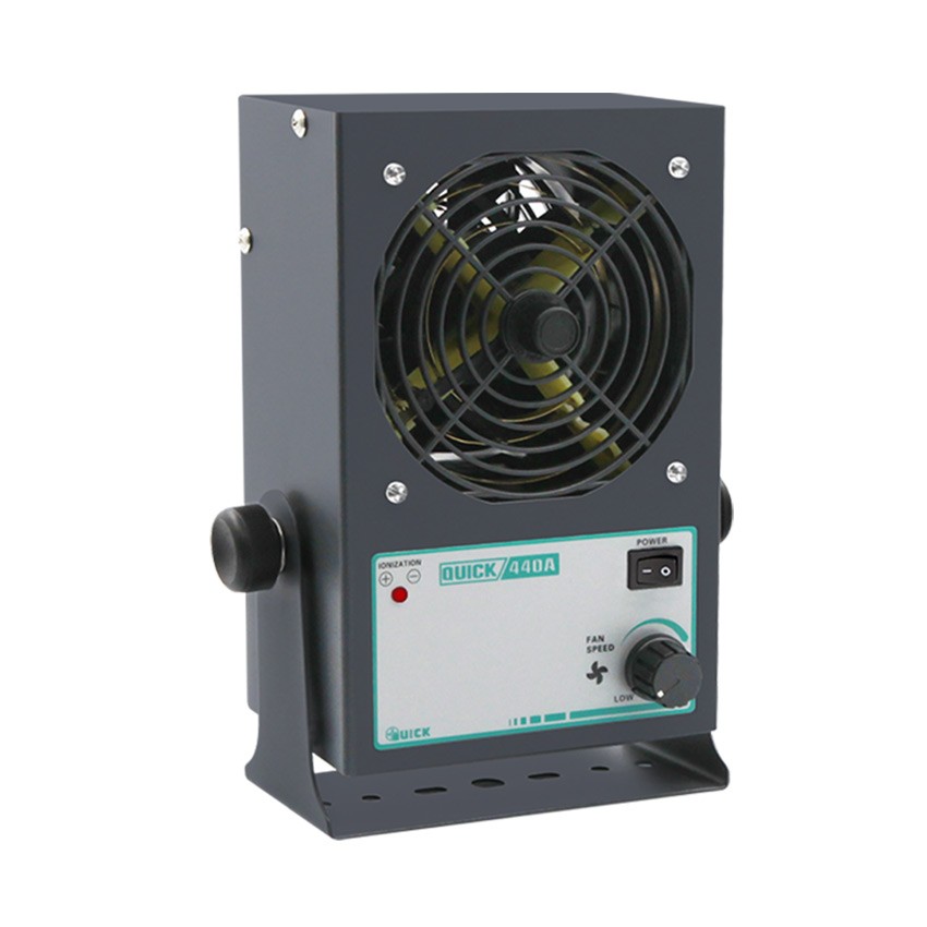 440A 离子风机 产品特点 1. 体积小,重量轻,便携式设计,角度可调。 2. 快速中和静电。 3. 大范围离子风区。 4. 可调速风扇产生大范围离子气流。 5. 离子平衡稳定,且可调节。 6. 采用漏磁式变压器,寿命长,防短路。 7. 内置离子发射器清洁器,清洁方便。 8. 安全低功耗加热器(有暖风装置的型号QUICK 440 AH)。