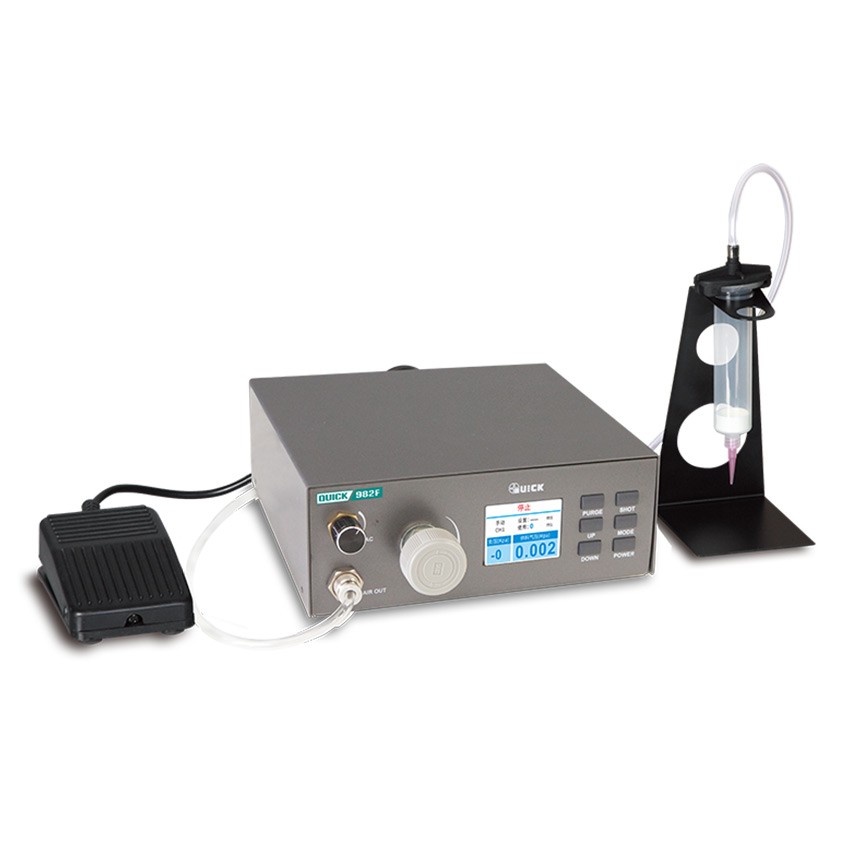 982F 点胶机 产品特点 1.由计时器控制每次注滴时间,定时、定量出胶,确保每次注胶量一致。 2.调节气压,选择适当的时间和针咀,便可改变每次注滴量和注滴时间,适合不同需要。 3.可注滴液体或浆料,有红胶、黄胶、环氧树脂、锡浆、矽胶、助焊剂等等。 4.脚踏控制及手动控制两种方式可供选择,配合手动开关更适合于站立的工作人员操作。 5.多种规格的针筒及针咀可供选择。 6.另有全自动点胶机可供选择。 操作示意图