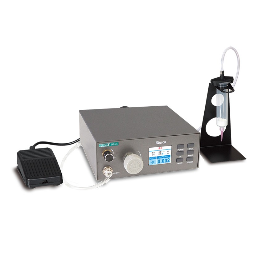 982E 点胶机 产品特点 1.由计时器控制每次注滴时间,定时、定量出胶,确保每次注胶量一致。 2.调节气压,选择适当的时间和针咀,便可改变每次注滴量和注滴时间,适合不同需要。 3.可注滴液体或浆料,有红胶、黄胶、环氧树脂、锡浆、矽胶、助焊剂等等。 4.脚踏控制及手动控制两种方式可供选择,配合手动开关更适合于站立的工作人员操作。 5.多种规格的针筒及针咀可供选择。 6. IOT物联网点胶机 7.另有全自动点胶机可供选择。 操作示意图
