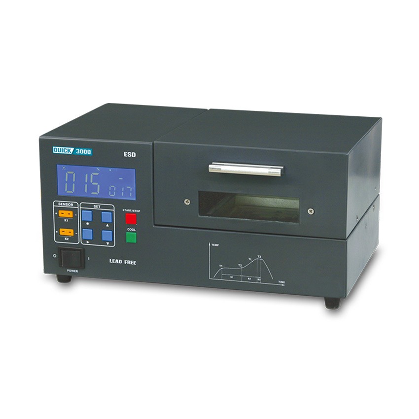 3000 BGA植球回流台 产品特点 1.采用暗红外加热原理,闭环温度控制,温度精确稳定,波动小。底部采用暗红外陶瓷盘加热,顶部采用高红外加热管加热,寿命超长。限度的缩小BGA的横向温差,防止BGA的冷焊或过热损坏现象。 2.设计有观察窗口,可以实时观察BGA芯片锡球的融化情况,可以不同规格的BGA同时焊接。 3.在焊接过程中打开加热箱体时设有声光报警。 4.当流程结束后打开箱体,冷却风扇自动工作;当关闭箱体时冷却风扇也同时停止工作。 5.面板设有两路外接K型传感器,可以监测BGA的实际温度,做到焊接有的放矢。 技术参数