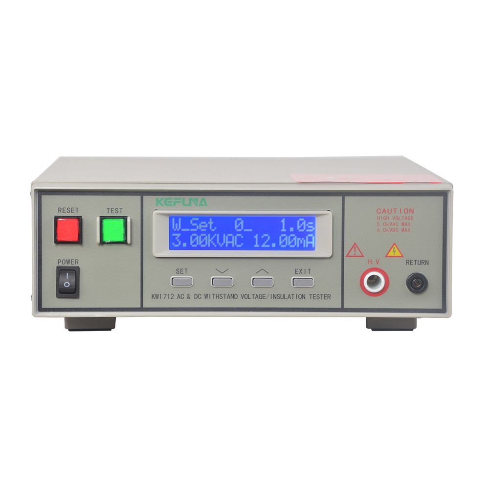 KWI 712耐压测绝缘测试仪;交流耐压(电流)测试所需的正弦波电压(电流)是采用线性功放推动输出,具有输出波形纯净、失真度小的优点。这些测试仪全部采用32bitARM作为主控制器进行设计,其输出电压的大小、频率及电压的上升、下降完全由MCU控制;能实时显示击穿电流值和电压值;配备PLC所需的信号输入、输出接口,可方便地与PLC组成综合测试系统。