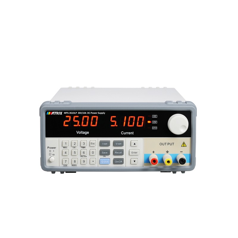 MPS-3600LP系列是新一代高品质可编程直流电源,该系列产品可配备通讯接口。 MPS-3600LP系列电源兼具桌面型和系统型的特点,可自由搭配其他仪器,集成到具有特殊功能的测试系统中,满足不同场合的测量需求,程序可编辑 通过面板键盘给用户带来极大的方便。 是普通可编程电源的替代产品,具有性价比高的优势。 产品特点 电压10mV电流1mA分辨率,高精度显示; 智能温控风扇,实用性极强; 数字键盘和旋钮两种方式设置电压和电流; 旋钮采用编码开关,使用方便,具有防误调功能; 九组电压、电流存储呼出功能,方便快捷; 每台机器最大功率可达360W; 输出开关控制,控制方便; 输入电压110V/220V切换,通用; 标准RS-232通讯接口。 技术参数 型号 | MPS-3603LP | MPS-3605LP | MPS-3610 LP | MPS-2010LP | MPS-6003LP | MPS-6005LP | 额定输出电压 | 0~36V | 0~36V | 0~36V | 0~20V | 0~60V | 0~60V | 额定输出电流 | 0~3A | 0~5A | 0-10A | 0~10A | 0~3A | 0~5A | 额度输出功率 | 108W | 180W | 360W | 200W | 180W | 300W | 负载调节率 | 电压 | 005%+5mV | 0.05%+8mV | 005%+10mV | 0.05%+10mV | 0.05%+5mV | 0.05%+8mV | 电流 | 0.1%+5mA | 0.1%+5mA | 0.1%+8mA | 0.1%+8mA | 0.1%+5mA | 0.1%+5mA | 电源调节率 | 电压 | 0.05%+5mV | 0.05%+8mV | 0.05%+10mV | 0.05%+10mV | 0.05%+5mV | 0.05%+8mV | 电流 | 0.1%+5mA | 0.1%+5mA | 0.1%+8mA | 0.1%+8mA | 0.1%+5mA | 0.1%+5mA | 设定分辨率 | 电压 | 10mV | 10mV | 10mV | 10mV | 10mV | 10mV | 电流 | 1mA | 1mA | 1mA | 1mA | 1mA | 1mA | 回读分辨率 | 电压 | 10mV | 10mV | 10mV | 10mV | 10mV | 10mV | 电流 | 1mA | 1mA | 1mA | 1mA | 1mA | 1mA | 设置精确度 (25℃±5℃) | 电压 | ≤0.1%+2字节 | ≤0.1%+2字节 | ≤0.1%+2字节 | ≤0.1%+2字节 | ≤0.1%+2字节 | ≤0.1%+2字节 | 电流 | ≤0.2%+3字节 | ≤0.2%+3字节 | ≤0.2%+6字节 | ≤0.2%+6字节 | ≤0.2%+3字节 | ≤0.2%+3字节 | 回读精确度 (25℃±5℃) | 电压 | ≤0.1%+2字节 | ≤0.1%+2字节 | ≤0.1%+2字节 | ≤0.1%+2字节 | ≤0.1%+2字节 | ≤0.1%+2字节 | 电流 | ≤0.2%+3字节 | ≤0.2%+3字节 | ≤0.2%+6字节 | ≤0.2%+6字节 | ≤0.2%+3字节 | ≤0.2%+3字节 | 纹波及噪声(25℃±5℃) | 电压 | 1mVrms | 1.5mVrms | 2mVrms | 2mVrms | 2mVrms | 2mVrms | 电流 | 3mArms | 3mArms | 6mArms | 6mArms | 3mArms | 3mArms | 温度系数 | 电压 | 300ppm | 300ppm | 300ppm | 300ppm | 300ppm | 300ppm | 电流 | 300ppm | 300ppm | 300ppm | 300ppm | 300ppm | 300ppm | 裸机尺寸(W*H*D) | mm | 215*95*300 | 215*95*300 | 215*95*355 | 215*95*355 | 215*95*355 | 215*95*355 | 装箱尺寸(W*H*D) | mm | 310*200*420 | 310*200*420 | 310*200*485 | 310*200*485 | 310*200*485 | 310*200*485 | 净重 | kg | 4.5 | 6.7 | 7.5 | 7.5 | 5.6 | 7 | 毛重 | kg | 5.6 | 7.8 | 8.6 | 8.6 | 6.7 | 8 |