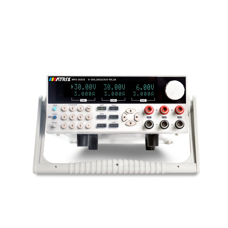 三通道可编程直流电源具有高分辨率、高精度和高稳定性,具有过压和过热保护功能。同时提供串联和并联工作。分辨率为10mV /1 mA。 产品特点 三通道同时显示和调整电流和电压; 智能温控乐趣,降低噪音; 串行/并行/跟踪模式; 低纹波和噪声; 可通过计算机进行校准和监控; 具有SENSE功能,可补偿线路上的压降; 输出时间可设定(0~9999.9s); 输出由开关控制; 40组存储可快速调用。 技术参数 型号 | MPS-3033S | MPS-3063S | MPS-6033S | 参数 | CH1 | CH2 | CH3 | CH1 | CH2 | CH3 | CH1 | CH2 | CH3 | 额定输出 | 电压 | 0~32V | 0~32V | 0~6V | 0~32V | 0~32V | 0~6V | 0~62V | 0~62V | 0~6V | 电流 | 0~3A | 0~3A | 0~3A | 0~6A | 0~6A | 0~3A | 0~-3A | 0~3A | 0~3A | 负载调节率 | 电压 | ≤0.01%+3mV | 电流 | ≤0.01%+3mA | 电源调节率 | 电压 | ≤0.01%+3mV | 电流 | ≤0.01%+3mA | 设定解析度 | 电压 | 10mV | 电流 | 1mA | 回读解析度 | 电压 | 10mV | 电流 | 1mA | 设定值精确度 | 电压 | ≤0.03%+2字节 | 电流 | ≤0.1%+5mA | ≤0.1%+8mA | ≤0.1%+5mA | 回读值精确度 | 电压 | ≤0.03%+2字节 | 电流 | ≤0.1%+5mA | ≤0.1%+8mA | ≤0.1%+5mA | 纹波与杂讯 | 电压(rms) | ≤2mVrms | 电流 | ≤5mArms | 串/并联设定值精确度 | 电压 | ≤0.02%+2字节 | 电流 | ≤0.1%+30mA | 记忆 | 储存/呼叫 | 40组 | 功能 | 定时关闭输出 | 计时器 | 时间设置 | 0.1s~3600s | 解析度 | 0.1s | 工作温度 | 0~40℃ | 裸机尺寸(W*H*D) | mm | 255*110*380 | 装箱尺寸(W*H*D) | mm | 325*210*475 | 净重 | kg | 8.5 | 11 | 11 | 毛重 | kg | 10 | 12.5 | 12.5 |