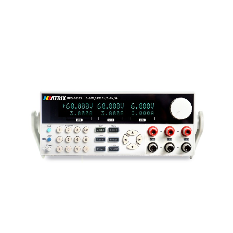 三通道可编程直流电源具有高分辨率、高精度和高稳定性,具有过压和过热保护功能。同时提供串联和并联操作。分辨率为1 mV / 1 mA。 产品特点 三通道同时显示和调整电流和电压; 智能温控乐趣,降低噪音; 串行/并行/跟踪模式; 低纹波和噪声; 可通过计算机校准和监控; 具有SENSE功能,可补偿线路上的压降; 输出时间可设定(0~99999.9s); 输出由开关控制; 40组存储可快速调用。 技术参数 型号 | MPS-3033X | MPS-3063X | MPS-6033X | MPS-3033XP | MPS-3063XP | MPS-6033XP | 额定输出 | 电压 | 0~32V*2/0~6V*1 | 0~32V*2/0~6V*1 | 0~62V*2/0~6V*1 | 0~32V*3 | 0~32V*3 | 0~32V*3 | 电流 | 0~3A*3 | 0~6A*2/0~3A*1 | 0~3A*3 | 0~3A*3 | 0~6A*3 | 0~3A*3 | 负载调节率 | 电压 | ≤0.01%+3mV | 电流 | ≤0.01%+3mA | 电源调节率 | 电压 | 0.01%+3mV | 电流 | ≤0.01%+3mA | 设定解析度 | 电压 | 1mV | 电流 | 1mA | 回读解析度 | 电压 | 1mV | 电流 | 1mA | 设定值精确度 | 电压 | ≤0.03%+10mV | 电流 | ≤0.1%+5mA | ≤0.1%+8mA | ≤0.1%+5mA | ≤0.1%+5mA | ≤0.1%+8mA | ≤0.1%+5mA | 回读值精确度 | 电压 | ≤0.03%+10mV | 电流 | ≤0.1%+5mA | ≤0.1%+8mA | ≤0.1%+5mA | ≤0.1%+5mA | ≤0.1%+8mA | ≤0.1%+5mA | 纹波与杂讯 | 电压(rms) | ≤2mVrms | 电流 | ≤5mArms | 串/并联设定值精确度 | 电压 | ≤0.02%+5mV | ≤0.02%+10mV | ≤0.02%+5mV | ≤0.02%+10mV | ≤0.02%+10mV | ≤002%+5mV | 电流 | ≤0.1%+30mA | 记忆 | 储存/呼叫 | 40组 | 功能 | 定时关闭输出 | 计时器 | 时间设置 | 0.1s~3600s | 解析度 | 0.1s | 工作温度 | | 0~40℃ | 裸机尺寸(W*H*D) | mm | 255*110*380 | 255*110*380 | 255*110*380 | 255*110*380 | 255*110*380 | 255*110*380 | 装箱尺寸(W*H*D) | mm | 325*210*475 | 325*210*475 | 325*210*475 | 325*210*475 | 325*210*475 | 325*210-475 | 净重 | kg | 8.5 | 11 | 11 | 13 | 13 | 13 | 毛重 | kg | 10 | 12.5 | 12.5 | 14.5 | 14.5 | 14.5 |