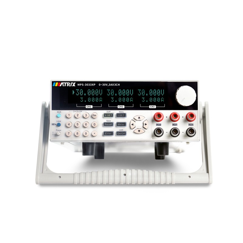 三路可编程直流电源,每路输出电压和输出电流均可设置,从0到最大额定输出值。 三通道电源具有高分辨率、高精度和高稳定性。 产品特点 可选串行、并行或同步 三通道可同时显示电压和电流值 1/2 2U超小尺寸 真空荧光显示器(VFD) 面板功能键LED显示 远程测量功能,补偿线路压降 分辨率高、精度高、稳定性高 输出可独立控制 过压、过热保护 智能温控风扇,降低噪音 标准USB/RS232通讯接口 低纹波和噪声 断电记忆功能 电脑软件监控 可保存40组设定数据,快速存储和调用 旋钮可用于调节电压和电流 定时输出时间(0.1~99999.9秒) 技术参数 型号 | MPS-3033X | MPS-3063X | MPS-6033X | MPS-3033XP | MPS-3063XP | MPS-6033XP | 额定输出 | 电压 | 0-32V*2/0~6V*1 | 0-32V*2/0~6V*1 | 0-62V*2/0~6V*1 | 0~32V*3 | 0~32V*3 | 0~62V*3 | 电流 | 0~3A*3 | 0~6A*2/0~3A*1 | 0~3A*3 | 0~3A*3 | 0~6A*3 | 0~3A*3 | 负载调节率 | 电压 | ≤0.01%+3mV | 电流 | ≤0.01%+3mA | 电源调节率 | 电 | ≤0.01%+3mV | 电 | ≤0.01%+3mA | 设定解析度 | 电压 | 1mV | 电流 | 1mA | 回读解析度 | 电 | 1mV | 电流 | 1mA | 设定值精确度 | 电压 | ≤0.03%+10mV | 电流 | ≤0.1%+5mA | ≤0.1%+8mA | ≤0.1%+5mA | ≤0.1%+5mA | <0.1%+8mA | ≤0.1%+5mA | 回读值精确度 | 电压 | ≤0.03%+10mV | 电流 | ≤0.1%+5mA | ≤0.1%+8mA | ≤0.1%+5mA | ≤0.1%+5mA | ≤0.1%+8mA | ≤0.1%+5mA | 纹波与杂讯 | 电压(rms) | ≤2mVrms | 电流 | ≤5mArms | 串/并联设定值精确度 | 电压 | ≤0.02%+5mV | ≤0.02%+10mV | ≤0.02%+5mV | ≤0.02%+10mV | ≤002%+10mV | ≤002%+5mV | 电流 | ≤0.1%+30mA | 记忆 | 储存/呼叫 | 40组 | 功能 | 定时关闭输出 | 计时器 | 时间设置 | 0.1s~3600s | 解析度 | 0.1s | 工作温度 | 0~40℃ | 裸机尺寸(W*H*D) | mm | 255*110*380 | 255*110*380 | 255*110*380 | 255*110*380 | 255*110*380 | 255*110*380 | 装箱尺寸(W*H*D) | mm | 325*210*475 | 325*210*475 | 325*210*475 | 325*210*475 | 325*210*475 | 325*210*475 | 净重 | kg | 8.5 | 11 | 11 | 13 | 13 | 13 | 毛重 | kg | 10 | 12.5 | 12.5 | 14.5 | 14.5 | 14.5 |