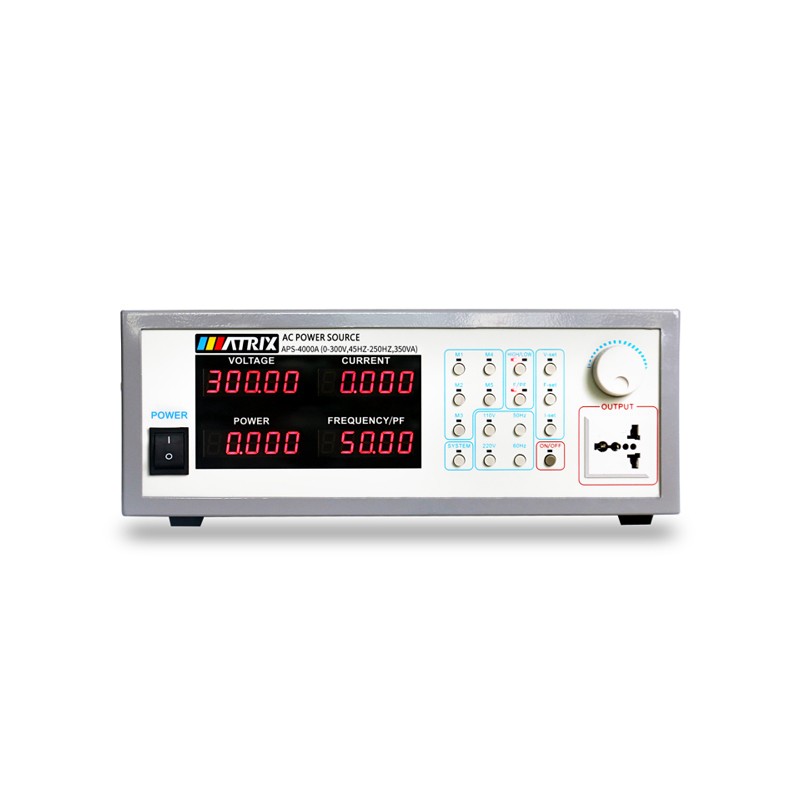 APS4000系列是350VA到1200VA的交流电源,输出频率:45Hz-250Hz连续可调(特殊频率可定制); 输出相电压:耐1V-150VAC,高档151V-300VAC,自动档1V-300V。 产品特点 采用先进的直接数字频率合成器(DDS)波形,频率稳定性高,连续性好,测量准确; 测量功能:电压、电流、频率、功率、功率因数; 过载能力强,300%过载2s; 键盘快捷键:110V、220V、50Hz、60Hz快捷键自组装; 智能分析功能:自动判断故障原因和情况,并在报警时显示代码; 按键锁定功能,防止误触; 带钥匙锁M1、M2、M3、M4、M5五组记忆,可存储常用电压V和频率F,一键调出方便; 配备100%加载和卸载功能,稳压反应时间在20ms以内; 输出电压0-150.00V、0-300.00V; 下推式无限编码旋钮开关,通过旋钮调节光标位置; 输入频率45.00-250.00Hz; 四窗五位显示,同时显示电压V、频率F、电流I、功率P、功率因数PF,更准确; 输入输出隔离; 具有软启动功能,避免上电时负载(如电机)的瞬时冲击电流对电源造成损坏。 技术参数