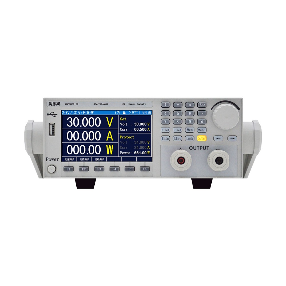 MSP6000系列可编程直流电源,美恩斯自主研发;电源采用有源功率因数矫正技术,前级开关,后级线性的设计,既提高了效率,又降低了纹波,体积小,重量轻,稳定性高等特点,广泛应用于电子产品开发,测试、检测、高等院校实验室、研究所等领域。 产品特点 具有PFC功率因数矫正,功率因数0.99 高分辨率1mV, 1mA,低纹波≤2mVrms List序列输出功能, OVP/OCP/OPP保护功能 SAVE/RECALL功能 软件U盘升级功能 4.3英寸LCD显示,TFT高清显示屏 标配RS232/485,USB device,LAN4种通讯接口 编辑指令集合SCPI、MODBUS-RTU 选配上位机控制演示软件 技术参数 | 参数 | MSP6015-60 | MSP6020-45 | MSP6030-30 | MSP6036-25 | MSP6045-20 | MSP6060-15 | MSP6080-11 | MSP60120-7.5 | MSP60150-6 | | 交流输入 | AC220V±10%, 50Hz | | 输出范围 | 电压 | 0-15V | 0-20V | 0-30V | 0-36V | 0-45V | 0-60V | 0-80V | 0-120V | 0-150V | | 电流 | 0-60A | 0-45A | 0-30A | 0-25A | 0-20A | 0-15A | 0-11A | 0-7.5A | 0-6A | | 功率 | 900W | 900W | 900w | 900W | 900W | 900W | 900W | 900W | 900W | | 设定解析度 | 电压 | 1mV | 1mV | 1mV | 1mV | 1mV | 1mV | 1mV | 10mV | 10mV | | 电流 | 1mA | 1mA | 1mA | 1mA | 1mA | 1mA | 1mA | 1mA | 1mA | | 回读解析度 | 电压 | 1mV | 1mV | 1mV | 1mV | 1mV | 1mV | 1mV | 10mV | 10mV | | 电流 | 1mA | 1mA | 1mA | 1mA | 1mA | 1mA | 1mA | 1mA | 1mA | | 负载调解率 | 电压 | ≤0.1%+5mV | ≤0.1%+5mV | ≤0.1%+5mV | ≤0.1%+5mV | ≤0.1%+5mV | ≤0.1%+5mV | ≤0.1%+5mV | ≤0.1%+5mV | ≤0.1%+5mV | | 电流 | ≤0.1%+5mA | ≤0.1%+5mA | ≤0.1%+5mA | ≤0.1%+5mA | ≤0.1%+5mA | ≤0.1%+5mA | ≤0.1%+5mA | ≤0.1%+5mA | ≤0.1%+5mA | | 电源调解率 | 电压 | ≤0.01%+4mV | ≤0.01%+4mV | ≤0.01%+4mV | ≤0.01%+4mV | ≤0.01%+4mV | ≤0.01%+4mV | ≤0.01%+4mV | ≤0.01%+4mV | ≤0.01%+4mV | | 电流 | ≤0.1%+3mA | ≤0.1%+3mA | ≤0.1%+3mA | ≤0.1%+3mA | ≤0.1%+3mA | ≤0.1%+3mA | ≤0.1%+3mA | ≤0.1%+3mA | ≤0.1%+3mA | 设定精度