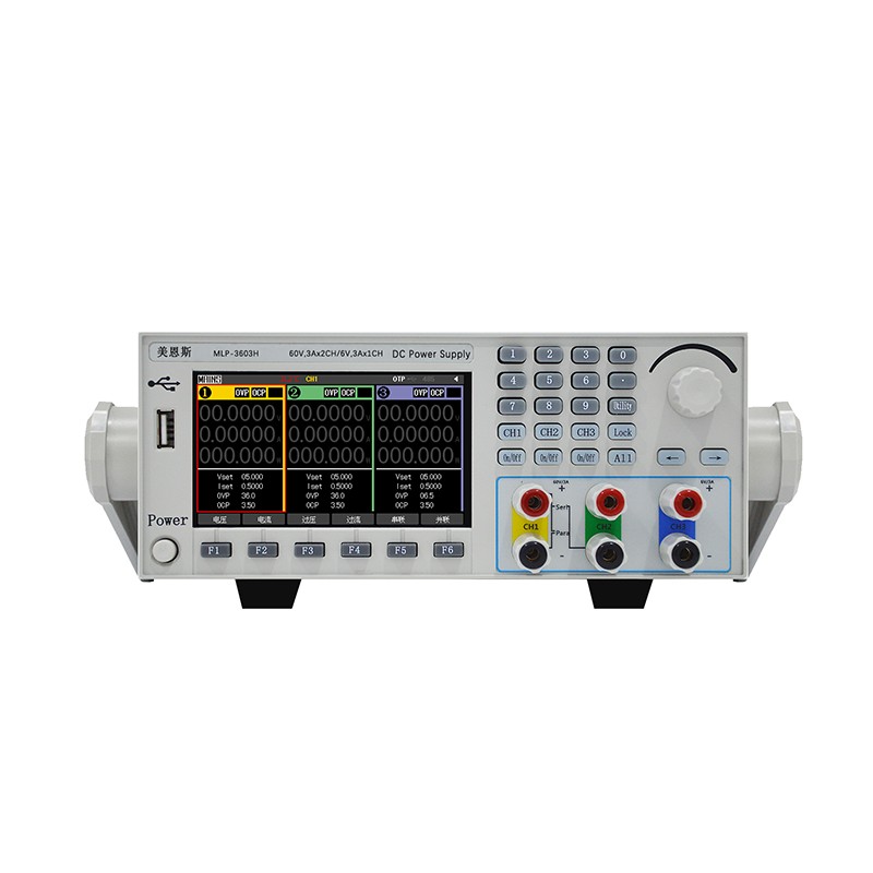 MLP-H系列多通道高精度可编程线性直流电源具有低纹波噪声,高分辨率,高精度的特点。本机可以内部串联、并联,满足了客户对更高电压或电流条件下的使用。本机还拥有LIST输出、定时器等高阶软件功能,以满足工业数字化的需求。本系列有六种基本机型,以满足不同用户群体。 本产品主要应用于需要输出电压或电流可调的逻辑电路场所,或对跟踪模式有需要的场所。产品标配USB Device接口、RS232接口、RS485接口、LAN接口,方便搭建自动测试系统。 技术参数 机型 | MLP-X323H | MLP-X306H | MLP-X603H | CH1&CH2 | CH3 | CH1&CH2 | CH3 | CH1&CH2 | CH3 | 电源模式 | 直流输出 | 电压 | 0~32.0000V*2 | 0-6.00000V | 0~30.0000V*2 | 0~ 6.00000V | 0~60.0000V*2 | 0~ 6.00000V | 电流 | 0-3.00000A | 0-3.00000A | 0-6.00000A | 0-3.00000A | 0-3.00000A | 0-3.00000A | 负载调节率 | 电压 | ≤0.01% + 3mV | ≤0.01% + 3mV | ≤0.02% + 6mV | ≤0.01% + 3mV | ≤0.02% + 6mV | ≤0.01% + 3mV | 电流 | ≤0.1% + 3mA | ≤0.2% + 6mA | ≤0.1% + 3mA | ≤0.2% + 6mA | ≤0.1% + 3mA | 电源调节率 | 电压 | ≤0.01% + 1mV | ≤0.02% + 3mV | ≤0.01% + 1mV | ≤0.02% + 3mV | ≤0.01% + 1mV | 电流 | ≤0.1% + 1mA | ≤0.2% + 3mA | ≤0.1% + 1mA | ≤0.2% + 3mA | ≤0.1% + 1mA | 纹波 | 常模电压 | ≤1mVrms | ≤2mVrms | ≤1mVrms | ≤2mVrms | ≤1mVrms | 常模电流 | ≤ 3m Arms | ≤ 6m Arms | ≤3mArms | ≤6mArms | ≤3mArms | 下降时间 | 满量程电压空载 | ≤50ms | ≤50ms | ≤50ms | 温度系数 | ≤300ppm/°C | ≤300ppm/°C | ≤300ppm/°C | 分辨率 | 编程电压 | 7mV | 7mV | 7mV | 编程电流 | 1mA | 1mA | 1mA | 读取电压 | 1mV | 1mV | 1mV | 读取电流 | 1mA | 1mA | 1mA | 编程精度 | 电压精度 | ≤±(0.01% + 10mV) | ≤±(0.01% + 10mV) | ≤±(0.01% + 10mV) | 电流精度 | ≤±(0.05%+20mA) | ≤±(0.05%+20mA) | ≤±(0.05%+20mA) | 读值精度 | 电压精度 | ≤±(0.02% + 10mV) | ≤±(0.02% + 10mV) | ≤±(0.02% + 10mV) | 电流精度 | ≤± (0.1%+20mA) | ≤±(0.1%+20mA) | ≤±(0.1%+20mA) | 并联 串联 | 负载变动率 | 0.01%+3mV | 不适用 | 0.02%+10mV | 不适用 | 0.02%+10mV | 不适用 | 电源变动率 | 0.01%+3mV | 0.02%+10mV | 0.02%+10mV | 负载变动率 | 15mV | 30mV | 30mV | 电源变动率 | 0.01%+5mV | 0.02%+10mV | 0.02%+10m V | 保护模式 | OVP | 范围 | OFF,ON(0.5V ~ 35.0V) | OFF,ON(0.5V ~ 6.0V) | OFF,ON(0.5V ~ 33.0V) OFF,ON(0.5V ~ 6.0V) | OFF,ON(0.5V ~ 65.0V) | OFF,ON(0.5V ~ 6.0V) | 分辨率 | 100mV | 100mV | 100mV | 设定精度 | ±100mV | ±100mV | ±100mV | OCP | 范围 | OFFQN(0.050A ~ 3.500A) | OFF,ON(0.050A ~ 6.500A) | OFF,ON(0.050A ~ 3.500A) | OFF,ON(0.050A ~ 3.500A) | 分辨率 | 10mA | 10mA | 10mA | 设定精度 | ±20mA | ±20mA | ±20mA | 主要功能 | 表头 | 显示方式 | 4.3"TFT-LCD | 4.3"TFT-LCD | 4.3"TFT-LCD | 通道特点 | 通道间隔离 | ● | ● | ● | 通道独立输出 | ● | ● | ● | 保护功能 | OVP保护 | ● | ● | ● | OCP保护 | ● | ● | ● | OTP保护 | ● | ● | ● | 特色功能 | 智能风扇控制 | ● | ● | ● | 数字输入 | ● | ● | ● | Preset键 | ● | ● | ● | 显示模式(波形/列) | ● | ● | ● | LCD参数设定 | ● | ● | ● | 功率显示 | ● | ● | ● | LIST输出 | ● | ● | ● | 定时器 | ● | ● | ● | 录制器 | ● | ● | ● | 监测器 | ● | ● | ● | 系统自检 | ● | ● | ● | USB Host | ● | ● | ● | 接口 | USB Device | ● | ● | ● | RS232 | ● | ● | ● | RS485 | ● | ● | ● | LAN | ● | ● | ● | GPIB(选配) | ● | ● | ● | 存储 | 状态(10组) | ● | ● | ● | 录制(10组) | ● | ● | ● | LIST(10组) | ● | ● | ● | 定时(10组) | ● | ● | ● |